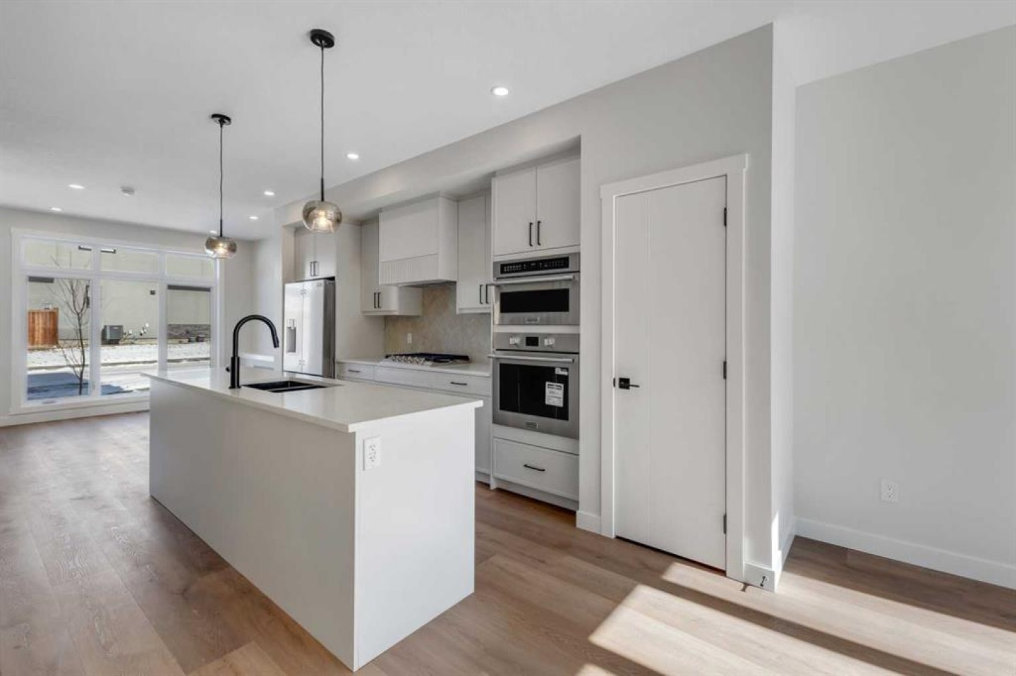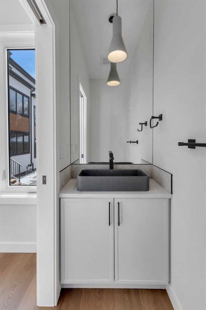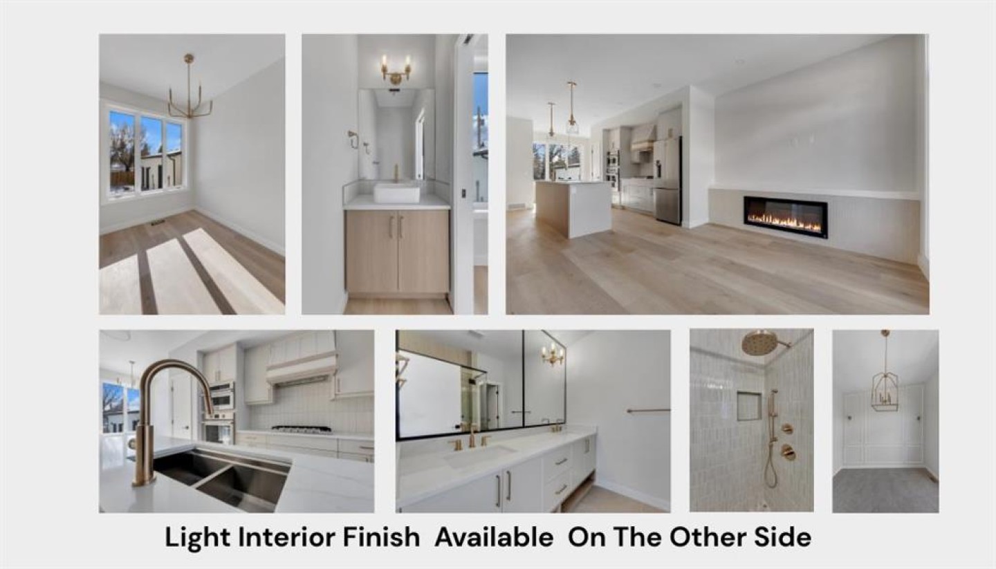 Welcome to THE SEVEN, an exclusive collection of seven luxury residences in the heart of Glenbrook, one of Calgary’s most sought-after inner-city communities. The opposite side of this semi-detached residence is also available, offering an alternate lighter designer finish palette. This particular home is a three-storey semi-detached residence (half duplex) offering 4 bedrooms and 4.5 bathrooms, including 3 private ensuites, thoughtfully designed for elevated urban living just minutes from downtown. Step inside to a spacious main floor where a generous living room welcomes you with striking dark flooring flowing throughout and a beautifully tiled fireplace that creates a warm, inviting focal point. The designer kitchen is built for both everyday living and entertaining, featuring a large statement island, built-in oven and microwave, gas cooktop, and a pantry for seamless storage. The dining area provides the perfect setting for hosting dinner parties or relaxed family meals, while the stylish powder room delivers a boutique-hotel inspired feel for guests. A functional mudroom is tucked away at the rear, offering a separate entrance to the backyard and detached garage. The second level features two spacious bedrooms, each complete with its own private ensuites providing comfort and privacy for family or guests. A dedicated laundry room with additional cabinetry adds everyday convenience. Occupying the entire third floor, the grand primary retreat is a true sanctuary. Enjoy vaulted ceilings, elegant wall sconces, and a statement chandelier above the bed, along with direct access to a private balcony—perfect for morning coffee or evening relaxation. The spa-inspired ensuite features a dual vanity, stunning tile work, and a glass-enclosed shower, while the walk-in closet is finished with custom shelving and built-in cabinetry. The fully developed basement expands the living space with a large recreation room, a stylish wet bar with under-cabinet lighting, an additional bedroom, and a full bathroom—ideal for guests, entertaining, or movie nights. Outside, the home’s exterior showcases a modern stucco façade accented with warm Hardie board details, creating striking curb appeal. Residents also enjoy a shared landscaped green space and access to the detached garage. Located in the vibrant community of Glenbrook, you’re just minutes from downtown Calgary while enjoying the charm of established inner-city living, with nearby parks, schools, restaurants, and everyday amenities all within easy reach. Experience sophisticated design, modern comfort, and urban convenience at THE SEVEN. Power lines digitally removed from exterior images for presentation purposes.