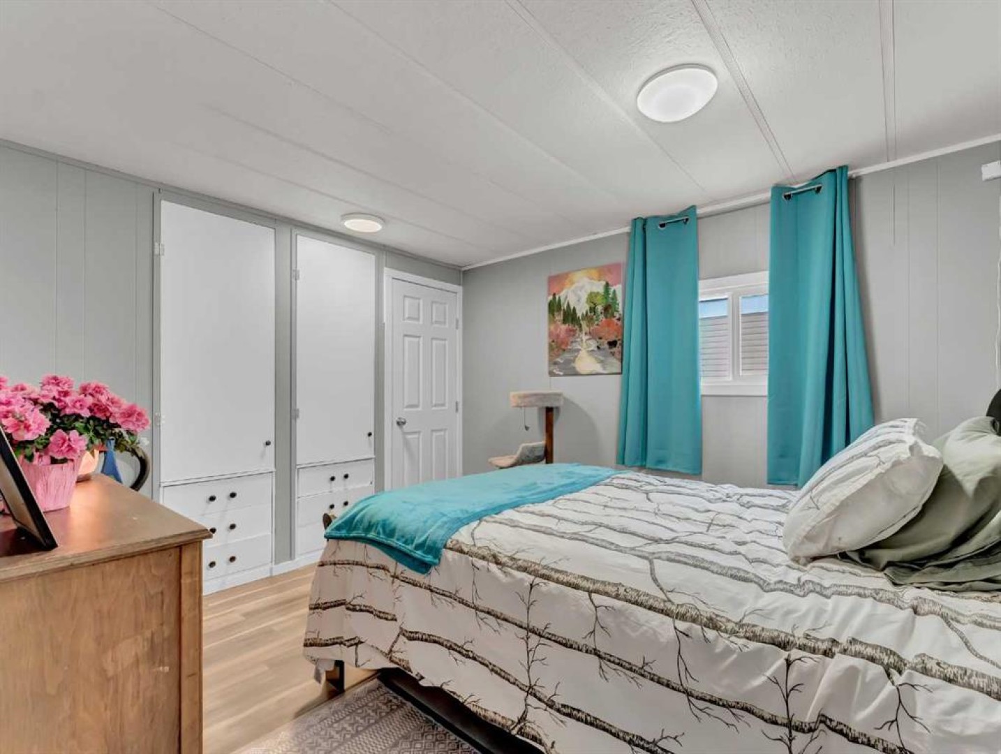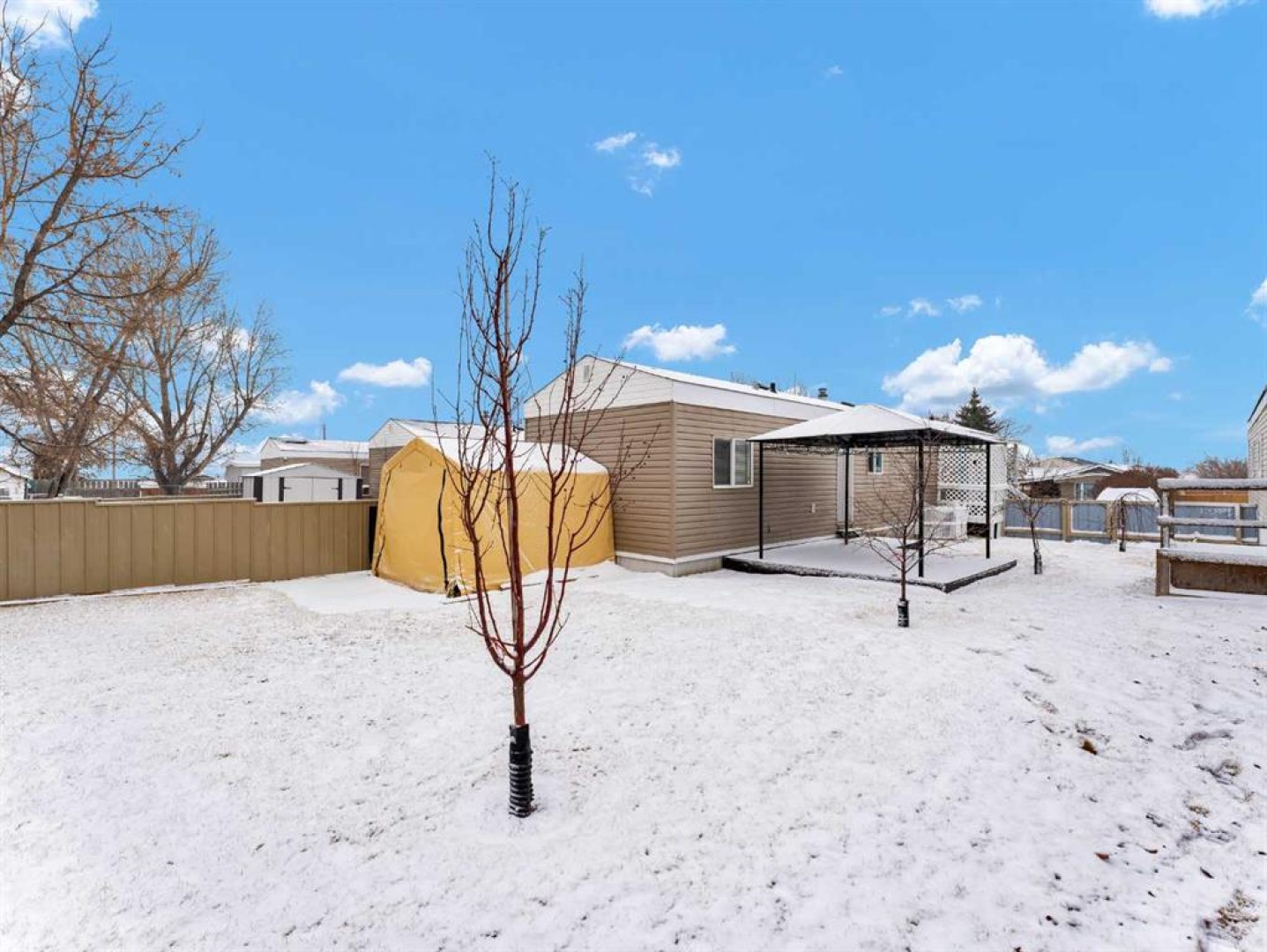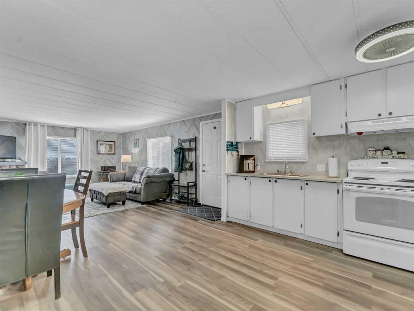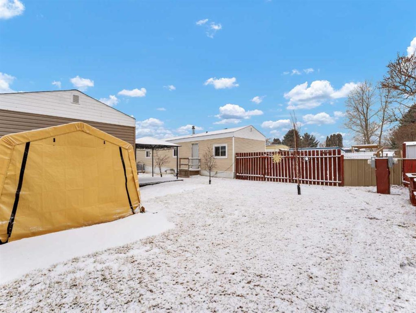 Step into this stylish and inviting 2-bedroom home, where a bright atmosphere greets you. The open-concept layout connects the kitchen, dining, and living areas, making it easy to enjoy time together. The bathroom has been thoughtfully updated, and durable flooring throughout offers low-maintenance comfort. Cozy up to the corner fireplace with a good book or a hot beverage on those chilly days or spend summer evenings beneath the spacious pergola after puttering in the fenced, roomy yard, which features plum and crab apple trees. A rechargeable lawnmower is also included with the purchase – no long chords to trip over! Newer vinyl windows have been installed as well as new blinds for most of the windows. For low maintenance and stress free living, this is the one for you! This home is located in a well maintained park that has a playground for the kids and is close to restaurants, shopping, schools, walking trails, public transit and much more! It's almost springtime planting season, so now is the perfect time to make the move! Utilities are included in the pad fee except for electricity.