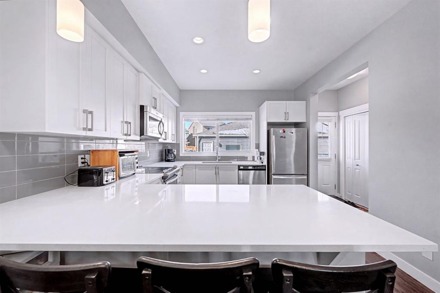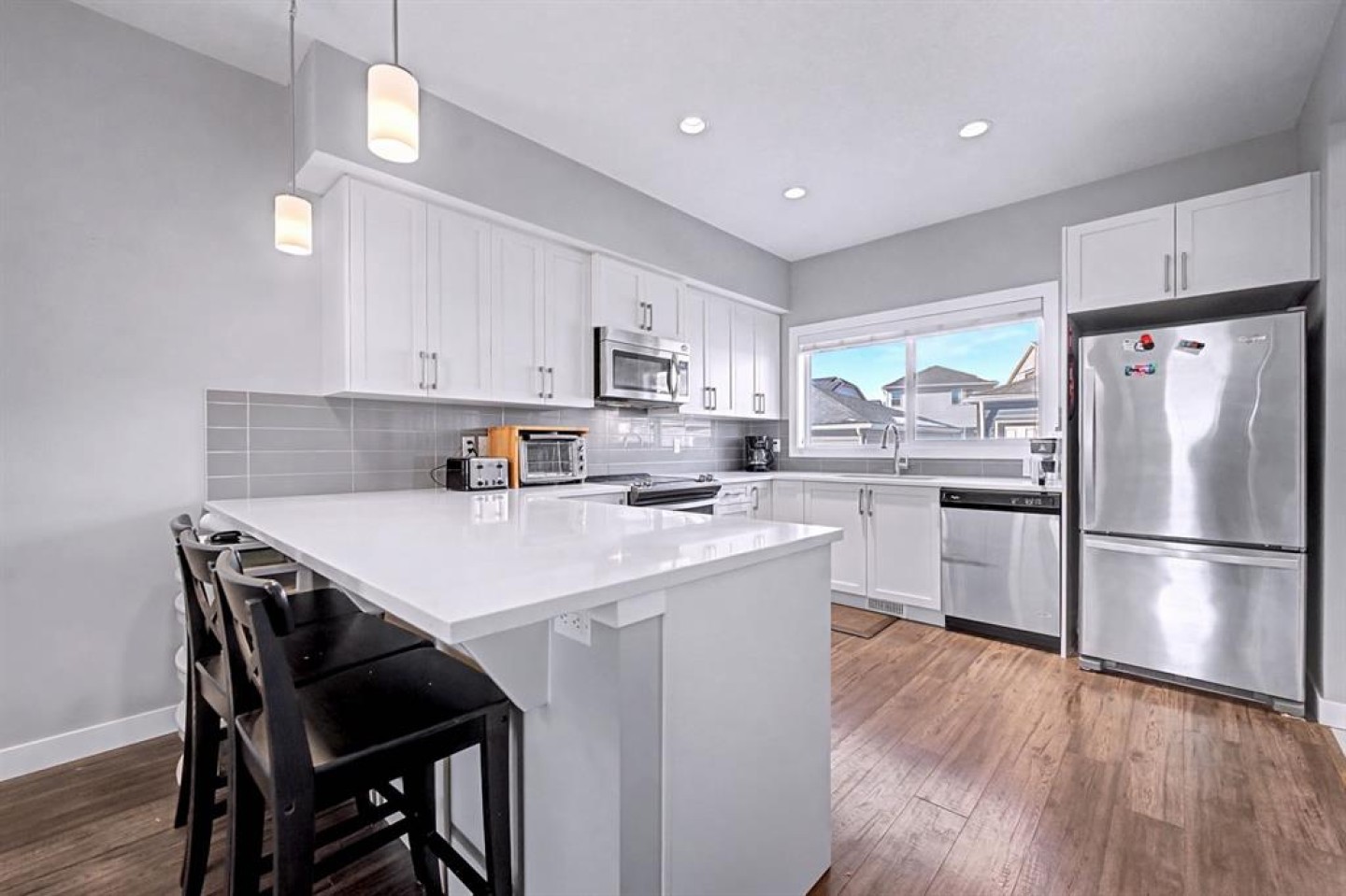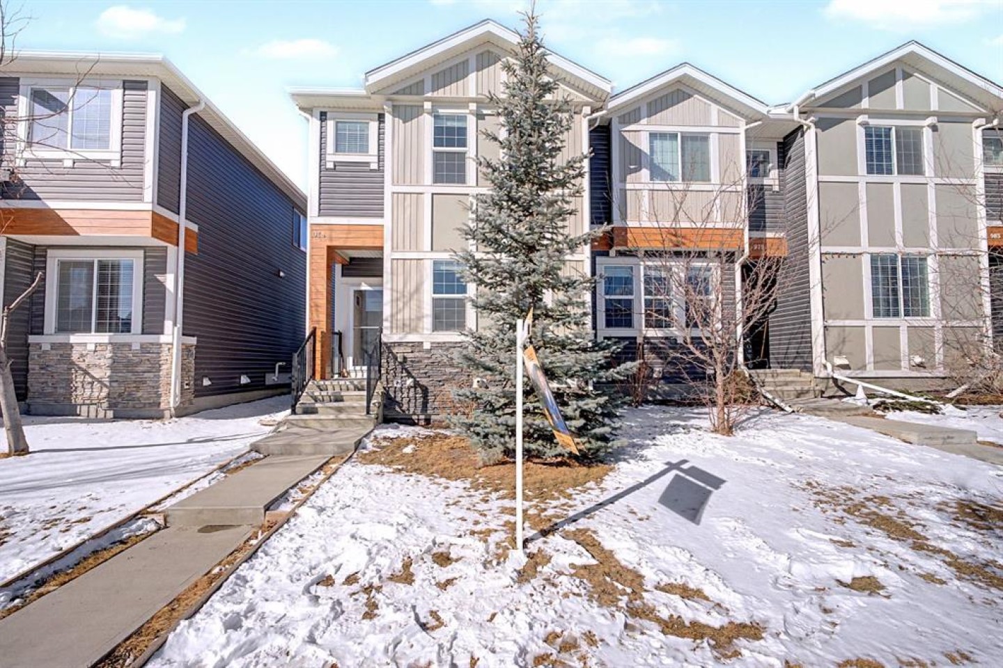 OPEN HOUSE, SAT (Mar 14) 1pm-4pm | Sunday (Mar 15) Open House CANCELED | NO CONDO FEES | END UNIT! | Welcome to this beautifully maintained end-unit 2-storey townhome with NO condo fees in the sought-after NW community of Nolan Hill, built by Shane Homes in 2015. Combining thoughtful design, modern finishes, and a functional layout, this home offers comfortable living with the added benefit of extra privacy as an end unit. Step inside to an inviting open-concept main floor where the bright living room is filled with natural sunlight from two large windows, creating a warm and welcoming atmosphere. The space flows seamlessly into the spacious dining area and well-appointed kitchen, perfect for both everyday living and entertaining. The kitchen features quartz countertops, stainless steel appliances, ample counter space, plenty of cabinetry, a breakfast bar, and a window overlooking the private backyard. Just off the kitchen you’ll find a convenient 2-piece bathroom, pantry, and direct access to the backyard, making outdoor gatherings and barbecues effortless. Upstairs, the home offers three comfortable bedrooms, including a bright primary retreat filled with natural light from two windows, complete with a walk-in closet and a private 3-piece ensuite. Two additional bedrooms, a 4-piece main bathroom, and stacked laundry conveniently located in the hallway complete the upper level. The fully finished basement offers approximately 617 sq. ft. of additional living space, featuring a 4-piece bathroom and plenty of storage, providing flexibility for a recreation area, home office, or additional living space. Step outside to enjoy your private fenced backyard, thoughtfully designed with both relaxation and functionality in mind. The yard features a beautiful crabapple tree, a concrete patio, and a wooden deck, creating the perfect space for summer barbecues, morning coffee, or relaxing evenings outdoors. The backyard also provides direct access to the double detached garage with convenient alleyway access, offering secure parking and additional storage. Located in the vibrant community of Nolan Hill, this home offers incredible convenience and lifestyle amenities. Enjoy nearby walking paths, scenic ponds, playgrounds, and green spaces, perfect for evening strolls, morning runs, or spending time outdoors with family and pets. Everyday essentials are just minutes away with Costco, restaurants, and shopping centres only about 5 minutes away, while quick access to Stoney Trail makes commuting across the city simple and efficient. This is a fantastic opportunity to own a modern, move-in-ready home with no condo fees in one of Calgary’s desirable northwest communities. SELECT PHOTOS ARE VIRTUALLY STAGED.