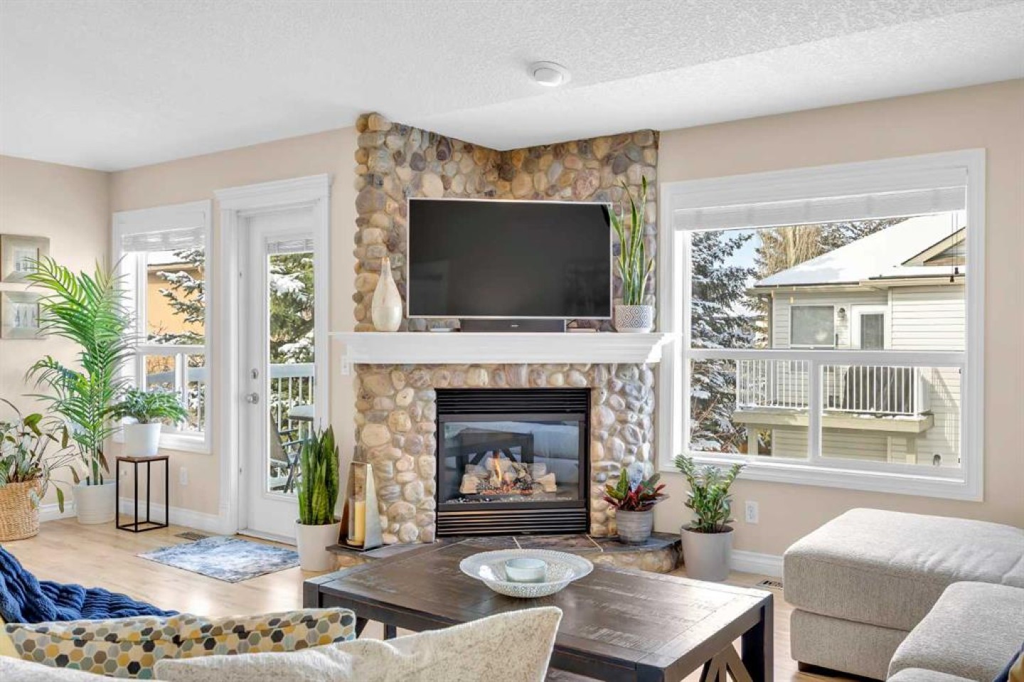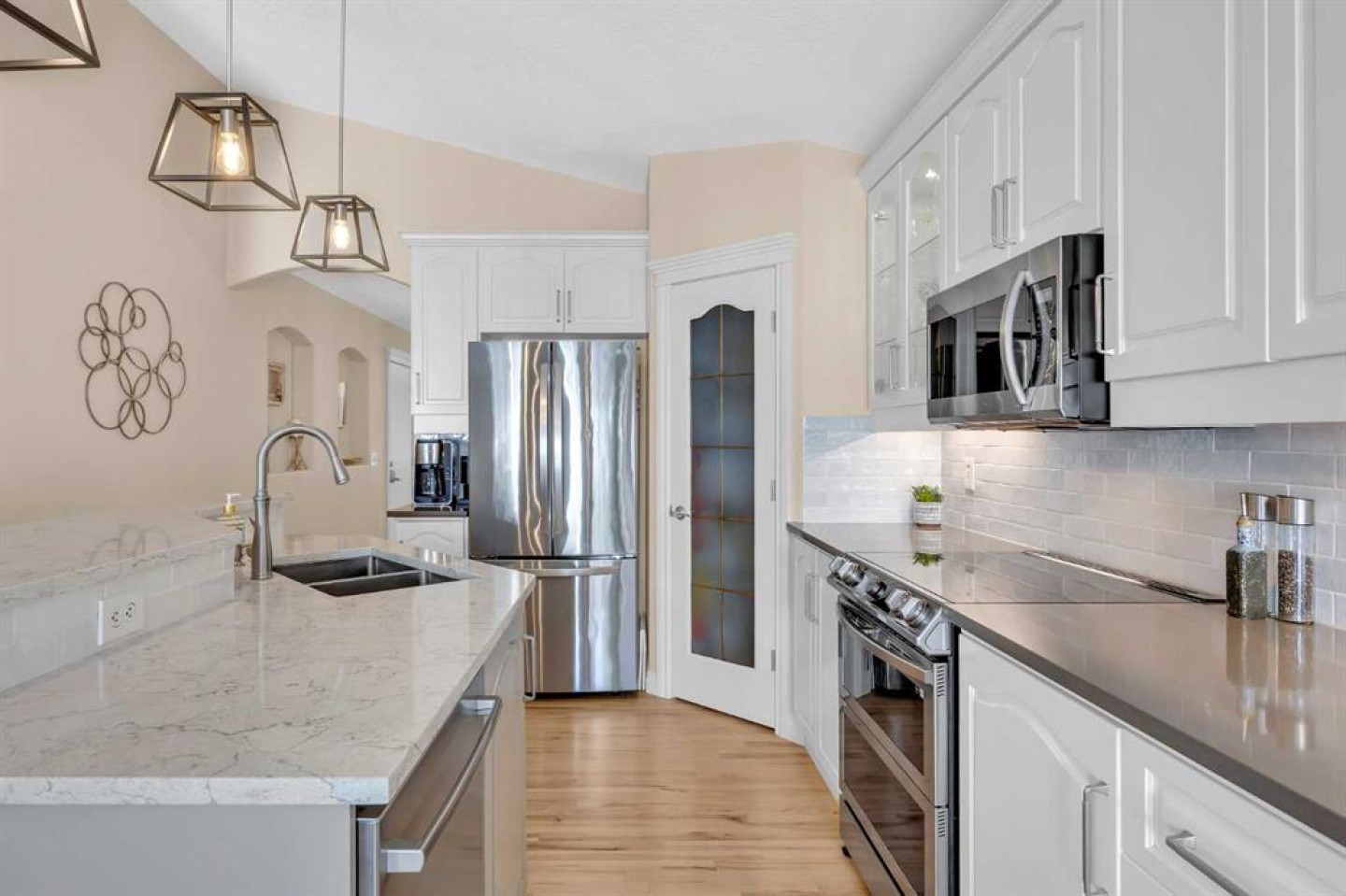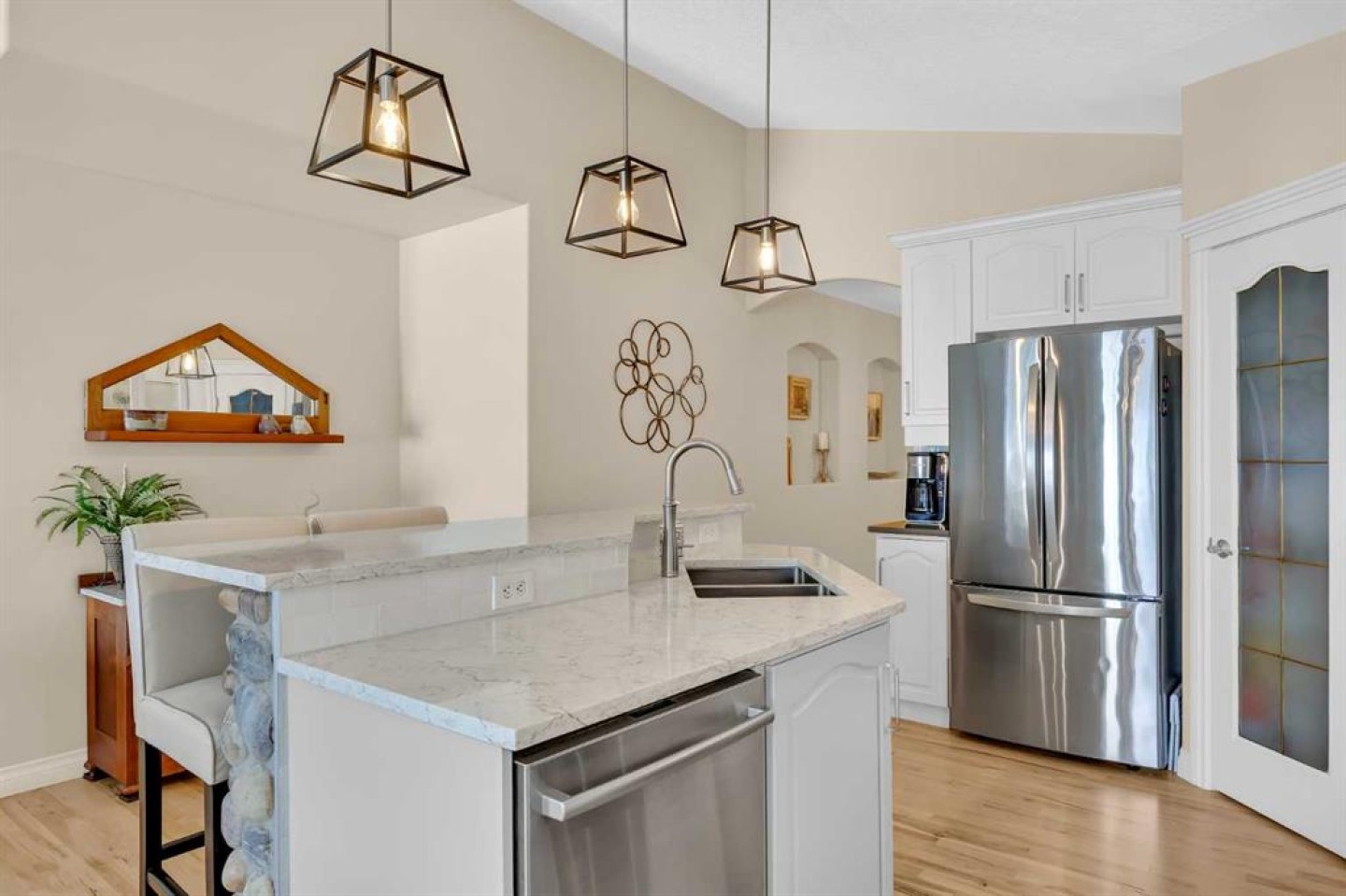 OPEN HOUSE March 21 & 22 from 1:00pm - 3:00 pm. A RARE Find! This Beautifully Renovated End-Unit Villa Bungalow with walkout basement offers over 2,600 sq ft of thoughtfully designed living space, complete with central A/C and an upgraded garage featuring Epoxy Floors. From the moment you step inside, a skylight fills the welcoming foyer with natural light, setting the tone for the bright, open feel throughout. Refinished hardwood floors flow seamlessly through the main living areas, creating a warm and inviting space that’s perfect for both everyday living and entertaining. The heart of the home is the open kitchen, dining and living room, perfect for gatherings. The Stunning kitchen is designed with both style and function in mind. Featuring Quartz countertops, Updated Cabinetry (2021), a Large Island, Walk-in pantry, and Stainless Steel Appliances (2021)—including an Induction Range with Double Ovens—this is a space any home chef will appreciate. Just off the dining area, step onto the balcony to enjoy your morning coffee or summer BBQs with the convenience of a Gas line. The main floor offers two generously sized bedrooms (one being used as an office), a convenient laundry room/bathroom with Custom Built-Ins, and excellent storage throughout. The Spacious Primary Suite is a true retreat, complete with vaulted ceilings, room for a king-sized bed and plenty of additional furniture, a walk-in closet, and a private ensuite with an oversized shower. Downstairs, the fully developed walkout basement is designed for comfort, connection, and flexibility. A large recreation room with a cozy fireplace, large windows and dedicated games area offers endless possibilities—from movie nights to fitness or family gatherings. Walk outside to a private patio and enjoy the peaceful setting of a large treed green space. A substantial third bedroom with its own private ensuite provides a comfortable and private space for guests. This Professionally Managed Complex offers a true lock-and-leave lifestyle, with lawn care and snow removal taken care of for you. With No Age Restrictions and Pet-Friendly living (board approval required), it’s a welcoming and connected community you’ll love to be part of. Additional highlights include: Beautifully updated main floor bathrooms with Custom Vanities and Quartz countertops, New lighting throughout, a High-Efficiency furnace and humidifier (2022), two Hot Water tanks and Central vacuum. Ideally located with easy access to major roadways, shopping, restaurants, and everyday amenities. Villa bungalows like this rarely come available—offering the perfect blend of comfort, space, and low-maintenance living in a well-established community. Book your private tour today!