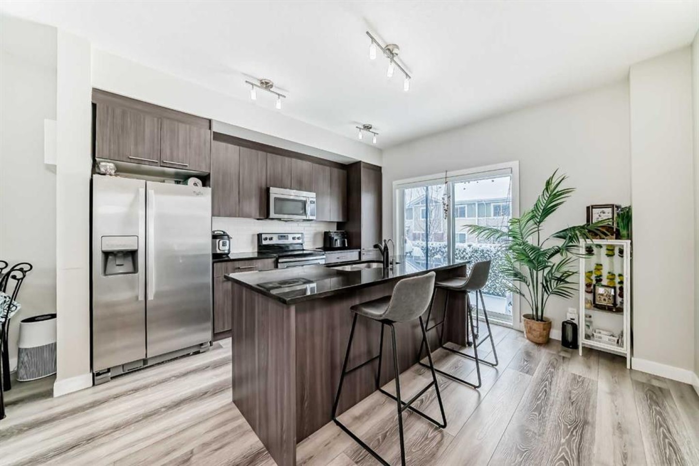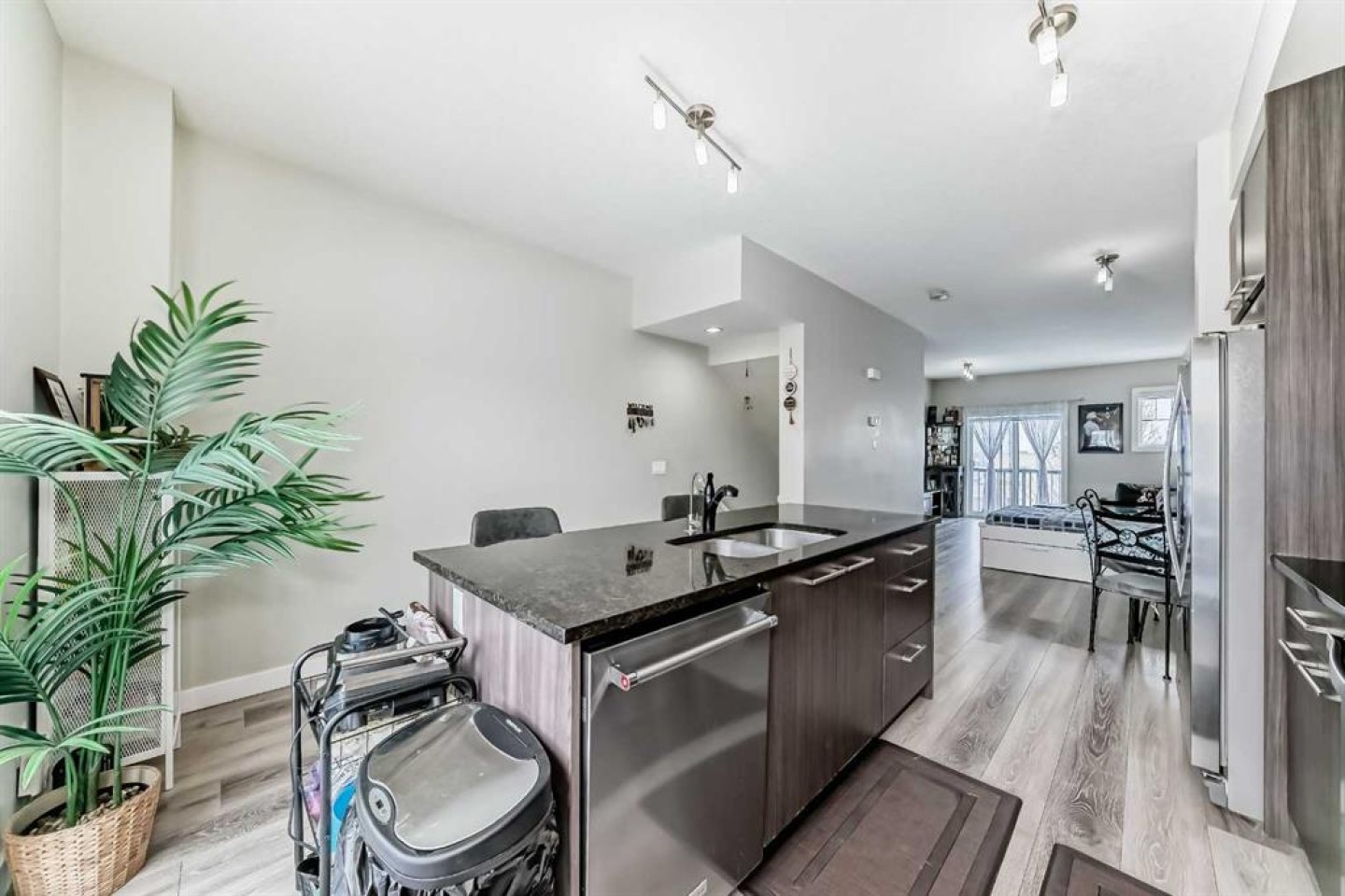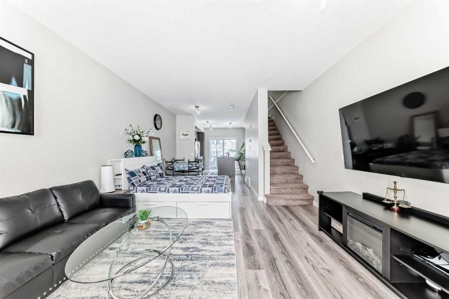 WELCOME TO CHESTERMERE MARINA DRIVE LIVING + LOW CONDO FEE + FRONT & BACK TWO BALCONIES + FRONT PRIVATE YARD + ATTACHED GARAGE + NEW A/C (2025) | NEW BLINDS (2026) | NEW 2-IN-1 WASHER/DRYER (2025) | GARAGE EPOXY. Fantastic opportunity to own a well-located home on Marina Drive STEPS FROM THE LAKE BEACH, AND directly across from a large plaza with GROCERY, BANKS, SHOP, and everyday amenities. The main floor offers a spacious entryway, sunny DEN, HOME OFFICE , HOME GYM OR EXTRA ROOM With 2-piece bath, and access to the attached garage with durable EPOXY FLOOR—designed to protect the floor, extend the life of your garage, and give it a clean, modern finish. The modern kitchen features granite countertops, STAINLESS STEEL APPLIANCES , and a large eat-up island, with access to a private balcony with BBQ gas line. The open-concept living and dining area leads to a second sunny balcony, perfect for relaxing or entertaining. Upstairs you’ll find 2 spacious BEDROOMS and a 4-piece BATHROOM. Enjoy an unbeatable lifestyle just minutes from the lake, BEACH, walking paths, schools, playgrounds, library, community centre, daycare, boating, swimming, and more. Move-in ready with great upgrades and an incredible location. DREAMING OF LUXURY LAKESIDE LIVING? THIS IS YOUR CHANCE, DON’T MISS THIS STUNNING OPPORTUNITY!”