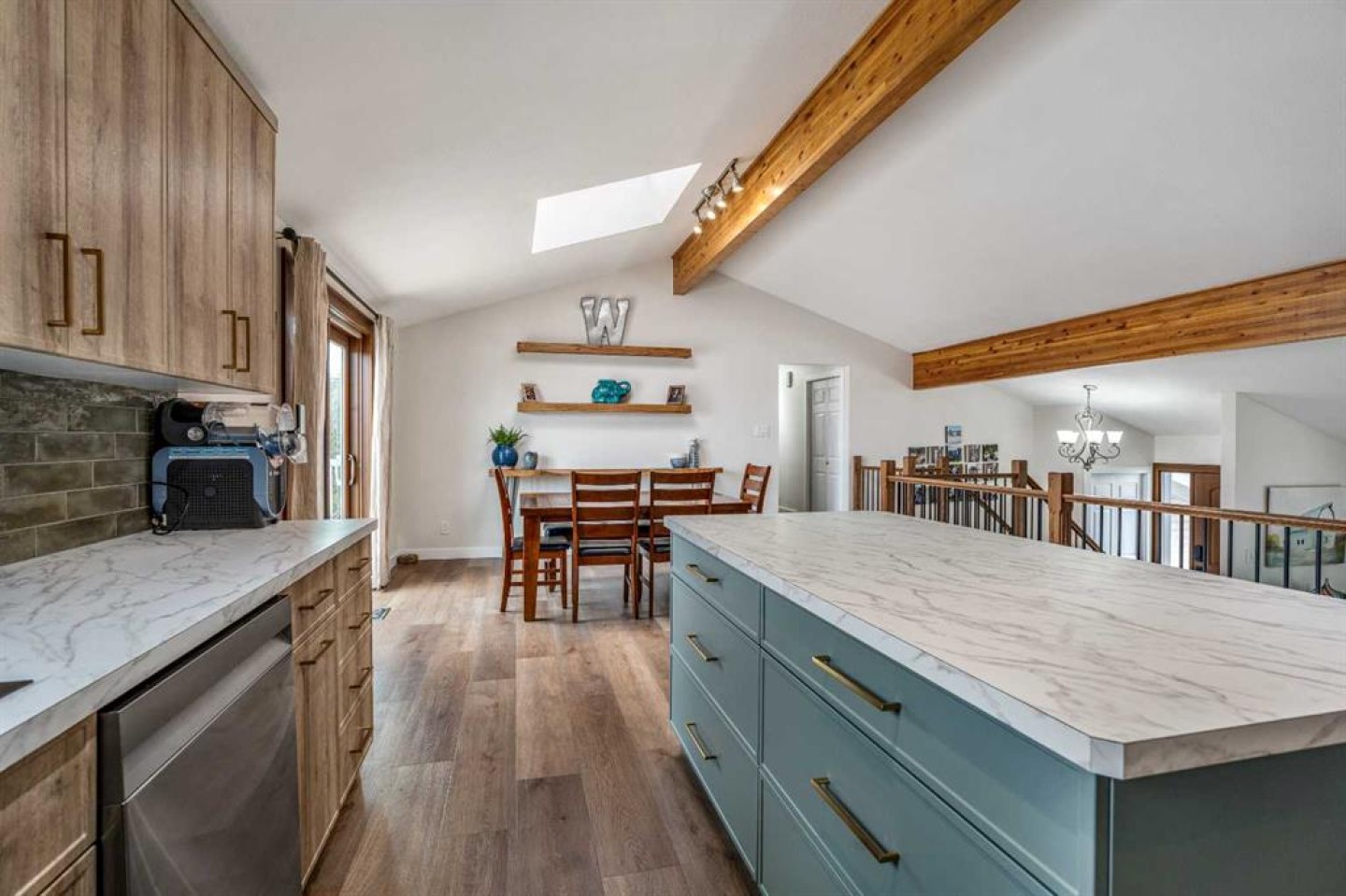 Breakfast Bar, High Ceilings, Kitchen Island, Laminate Counters, Natural Woodwork, Open Floorplan, Separate Entrance, Skylight(s), Storage, Vaulted Ceiling(s), Wet Bar