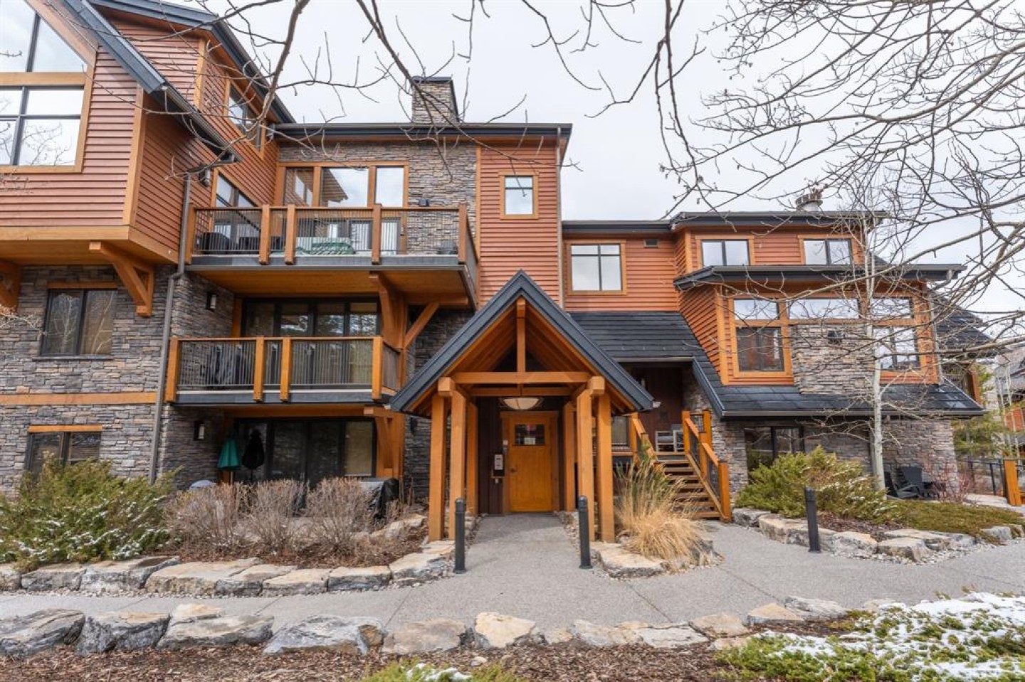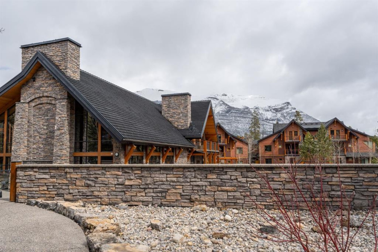 This warm and inviting 1 bedroom plus den, 2 bathroom condo features an open-concept layout highlighted by rich hardwood floors, timber accents, and a stunning stone gas fireplace that creates the perfect alpine atmosphere. The kitchen offers granite countertops, stainless steel appliances, slate tile backsplash, and a spacious eating bar ideal for entertaining. Large windows and sliding doors bring in plenty of natural light and lead to a private covered balcony where you can relax and take in the peaceful mountain surroundings. The primary bedroom features a well-appointed ensuite, while the second bedroom provides flexible space for guests, family, or a home office. Additional features include in-suite laundry, ample storage, and quality finishings throughout. Located in the desirable community of Stewart Creek, you’ll enjoy easy access to walking trails, golf, and all the amenities of Canmore while being surrounded by the beauty of the Rockey Mountains.