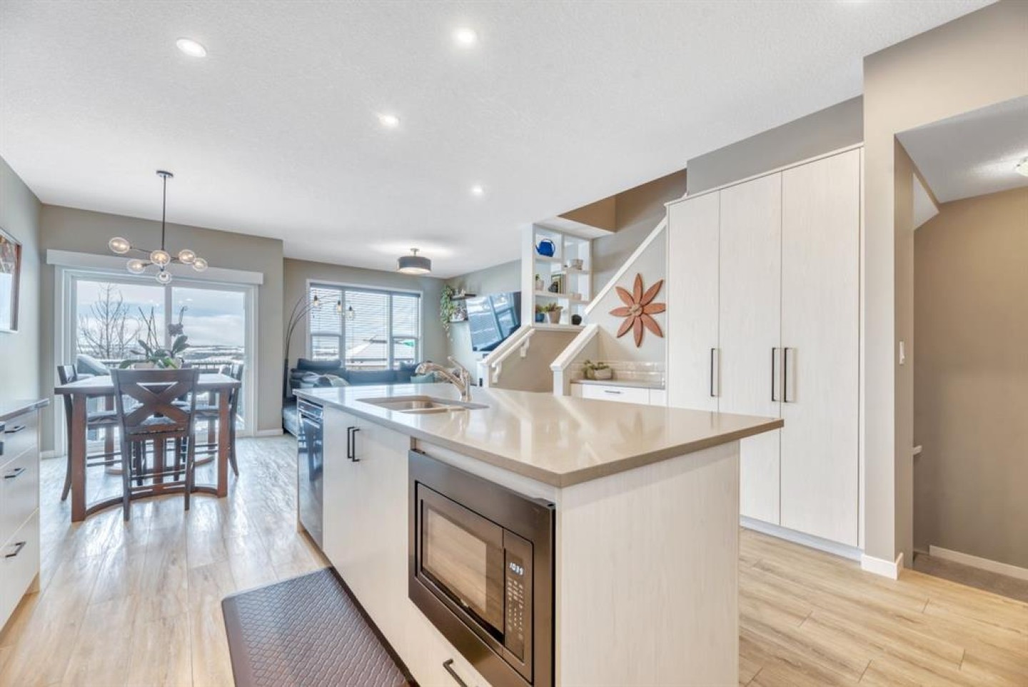 Welcome to 840 Seton Circle SE, a beautifully maintained and thoughtfully upgraded home offering stylish living in one of Calgary’s most vibrant and amenity-rich communities. From the moment you arrive, the charming front pergola and beautiful landscaping creates a warm first impression and leads you into a spacious foyer with a front closet and extra window for natural lighting. Step inside and you’ll immediately notice the bright, open-concept layout enhanced by natural light streaming in from the SW facing backyard. The main living area flows to create an inviting space. At the heart of the home is the stunning kitchen, designed with both function and style in mind. A large central island provides ample prep space and seating, while ceiling-height cabinetry, quartz countertops, a classic subway tile backsplash add timeless style. The stainless appliances complement the space beautifully, and two custom built-in pantries and built in tech desk provides exceptional storage and organization. Just off the kitchen, the dining area comfortably accommodates a large table and offers easy access through sliding patio doors to the rear deck, making indoor-outdoor entertaining seamless during the summer months. The sun-filled living room features large windows, a custom crafted electric fireplace and provides a comfortable place to unwind. Completing the main level is a convenient powder room with a gorgeous walnut vanity and access through a spacious mudroom with even more built in custom cabinetry to the single attached garage. The primary suite is situated at the back of the home, offers unobstructed mountain views to enjoy year-round. The spacious ensuite includes a tiled shower, double vanity with quartz counters, and a large walk-in closet featuring custom built-in organizers. Central air conditioning and ceiling fan ensures year-round comfort. Two additional generously sized bedrooms, a stylish four-piece bathroom, and the convenience of upper-level laundry complete this floor. The fully finished basement expands the home’s living space and includes a large recreation/media area, fourth bedroom, and a full bathroom, great for guests, visitors or lounging. The mechanical room is a massive storage space full of shelving. This home has been further enhanced with thoughtful upgrades including custom built-in closets and storage solutions throughout, feature wall at the staircase, an extended driveway that easily fits 2 vehicles, hot water on demand, and a beautifully designed backyard with a two tiered deck for entertaining all summer long. Located in the thriving community of Seton, you’ll enjoy quick access to Stoney Trail and Deerfoot Trail, along with nearby shopping, restaurants, coffee shops, entertainment, and the South Health Campus. Residents also benefit from exclusive access to The Block – Seton Homeowners Assoc, featuring amenities including party rooms, splash park, hockey rink, playgrounds, & more! Come & take a look!