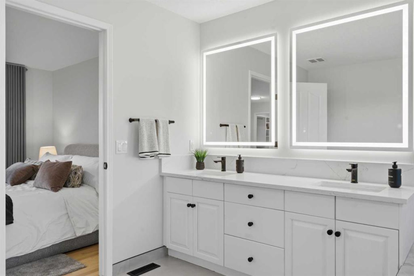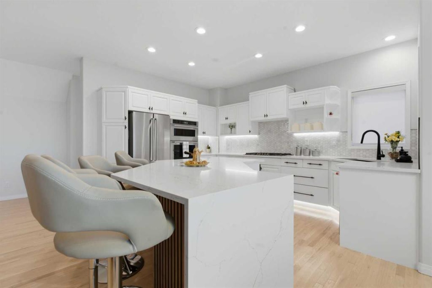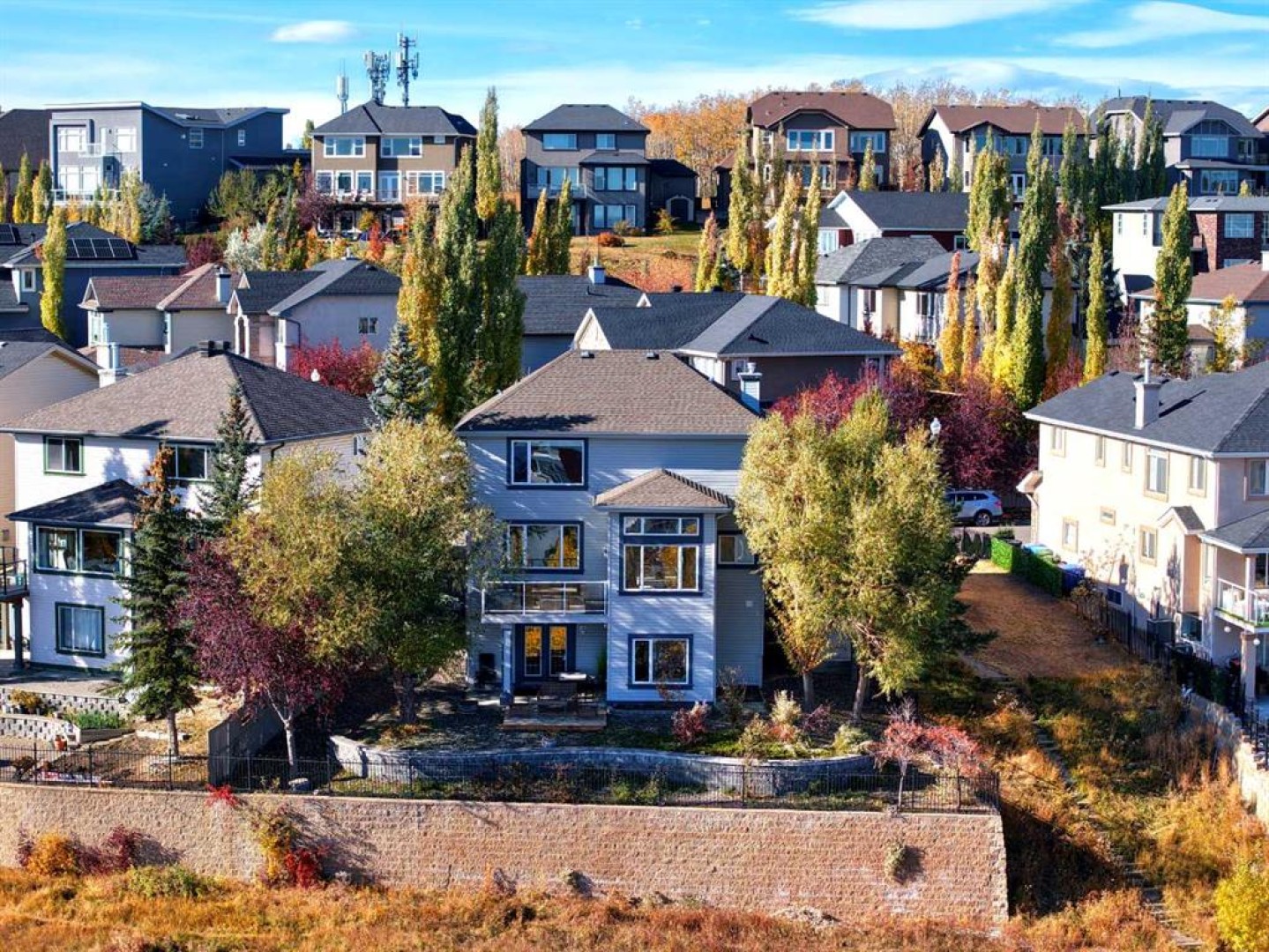 PANORAMIC BLUFF VIEWS | BACKING ONTO SPRINGBANK HILL RIDGE | HUGE PIE LOT | FINISHED WALKOUT BASEMENT | DESIGNER UPGRADES | HEATED DOUBLE GARAGE | Panoramic ridge views and a coveted position backing onto the bluffs of Springbank Hill define this beautifully updated residence set on a huge pie-shaped lot. Contemporary design elements and thoughtful upgrades introduce a refined aesthetic while an open-concept layout allows natural light and sweeping vistas to shape the atmosphere throughout the home. Oversized windows frame the landscape beyond the backyard while a gas fireplace establishes a warm focal point within the welcoming living area. Culinary creativity finds its place in a carefully designed kitchen equipped with a gas cooktop, stainless steel appliances, crisp white cabinetry, a hexagon tile backsplash and a generous waterfall-edge breakfast bar island suited for casual dining and conversation. Walls of glass surround the dining space where soaring ceilings and cascading designer lighting accompany uninterrupted views, creating an impressive setting for gatherings and everyday meals alike. Glass railings border the elevated deck, offering an exceptional vantage point over the bluffs and an inviting outdoor destination for BBQs, relaxing and warm-weather entertaining. Time spent together continues upstairs in a vaulted bonus room that provides ample space for movie nights or games. Tranquility defines the primary retreat where breathtaking views, a comfortable sitting area and a custom walk-in closet enhance everyday living while the ensuite includes dual sinks, a deep soaker tub and an oversized rain shower. One additional bright bedroom and a full bathroom complete the upper level. Style continues into the fully finished walkout basement where a sleek wet bar supports effortless entertaining alongside a built-in bar-top workspace and a spacious recreation area centered around a second fireplace. Two more bedrooms, a full bathroom and a second laundry area introduce flexibility for guests, extended family or short-term rental possibilities. Outdoor living extends across multiple seating areas including a covered lower patio and rear deck, all surrounded by mature trees and panoramic southwest skyline views. Year-round convenience comes from the insulated, drywalled and heated double garage. Direct access to nearby walking paths enhances the lifestyle offered in this sought-after community, with top-rated schools, several golf courses and everyday amenities just minutes away at West 85th, Aspen Landing and Westhills Towne Centre. Recreation opportunities await at Westside Recreation Centre and Griffith Woods Park while downtown Calgary remains easily accessible. Carefully curated upgrades and exceptional surroundings combine to create a modern retreat designed to embrace the best of Springbank Hill living.
