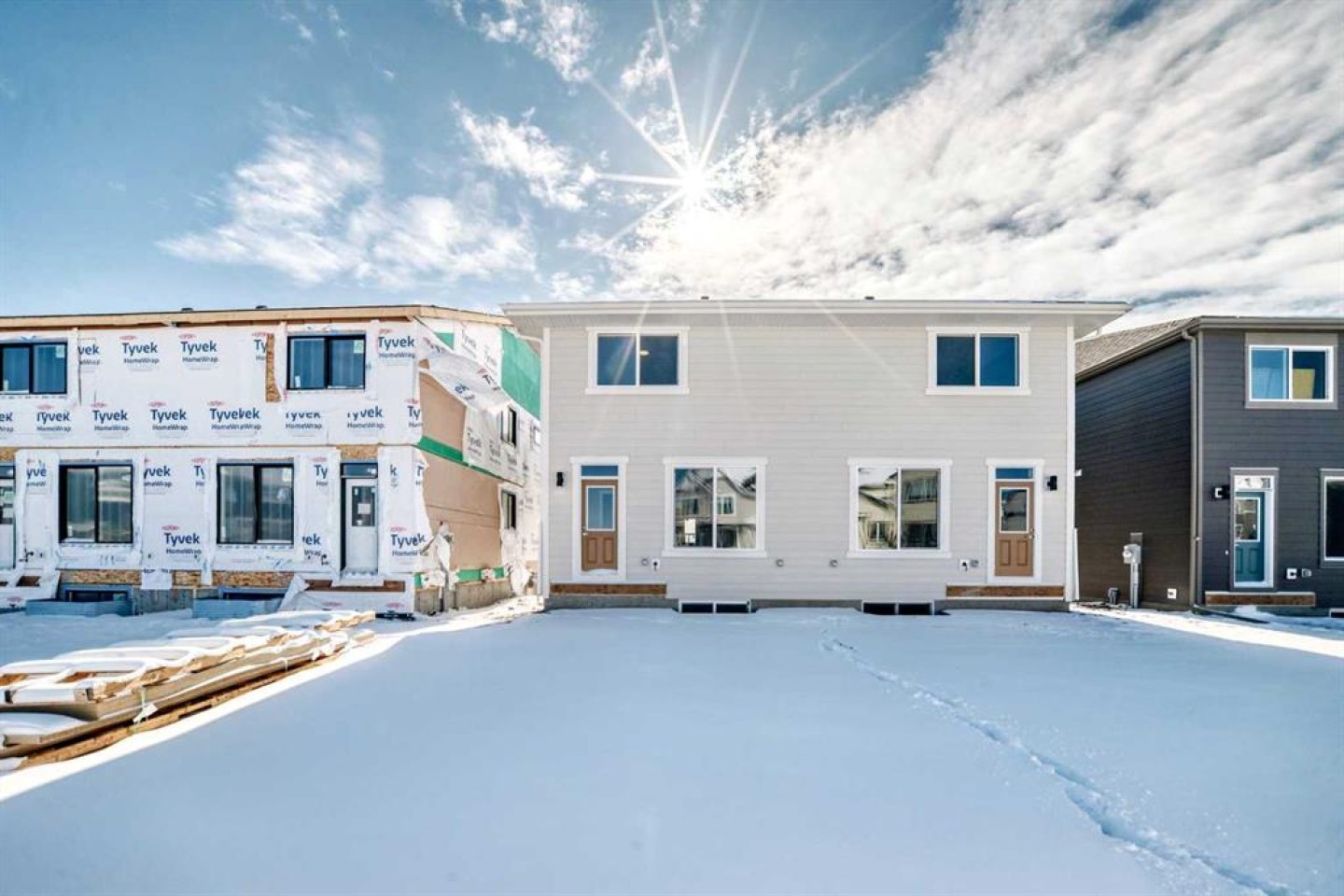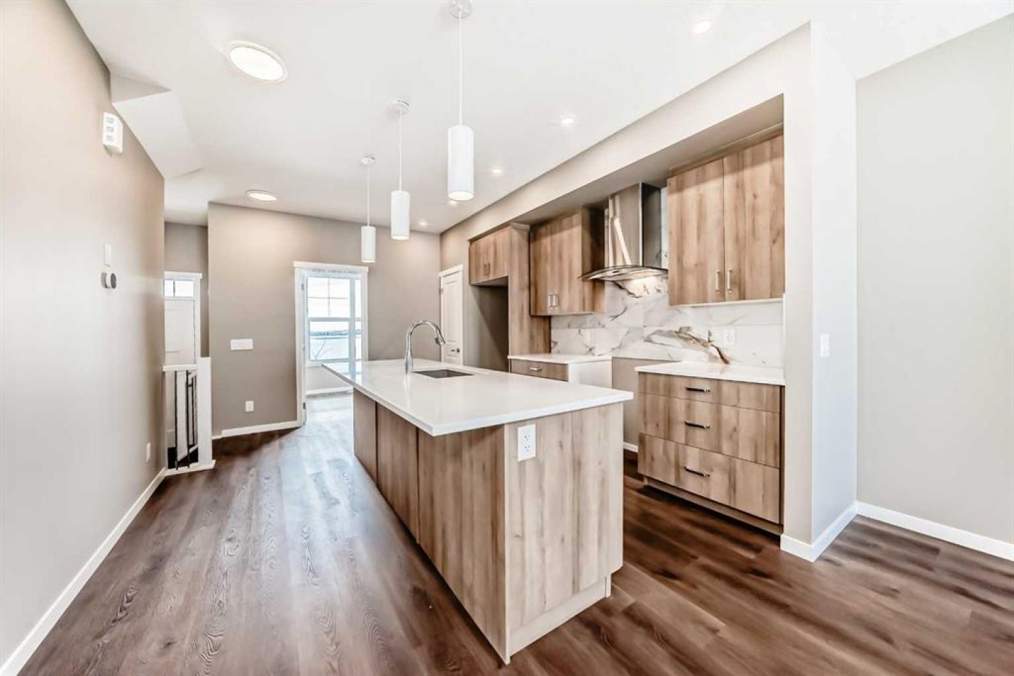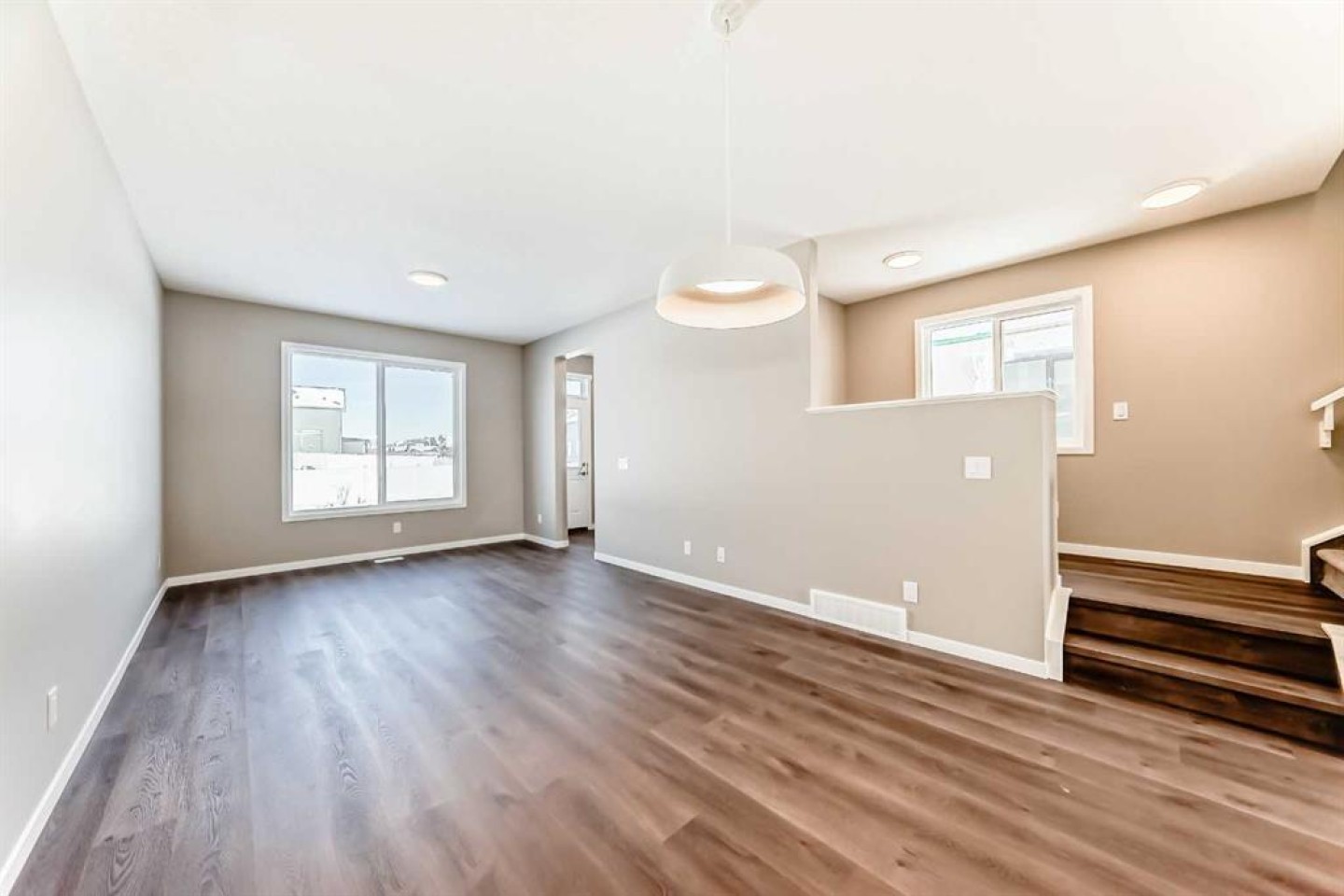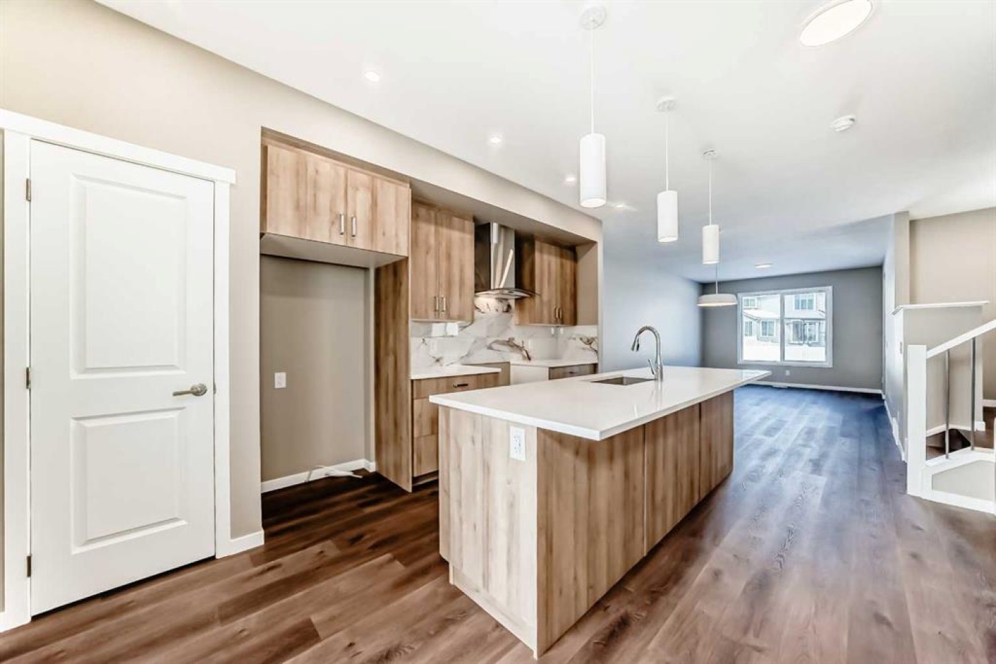 Welcome to the brand-new “Rayn” in Mahogany, a thoughtfully designed home that blends modern style, functional living, and family-friendly comfort. From the moment you step inside, the home makes a strong first impression with warm natural luxury vinyl plank flooring and a bright, contemporary interior that feels both welcoming and refined. The main floor is designed for everyday living and effortless entertaining with an open-concept layout that connects the kitchen, dining, and living areas seamlessly. At the heart of the home, the central kitchen features timeless white cabinetry extended to the bulkhead, sleek white quartz countertops, stainless steel appliances, and a marble-inspired backsplash that wraps the stand-alone chimney hood fan for a clean, upscale finish. A large island provides plenty of prep space, casual seating, and a natural gathering place for family and friends. The dining area sits comfortably between the kitchen and living room with room for a full dining table, while the rear living room is filled with natural light from impressive floor-to-ceiling windows. A convenient rear mudroom entry with a 2-piece bathroom adds everyday practicality, while the versatile flex room just off the kitchen can easily function as a home office, playroom, study space, or quiet reading area. A raised homework or tech nook overlooking the main floor adds another thoughtful and functional touch for busy households. Upstairs, a central bonus room creates the perfect place for movie nights, a kids’ lounge, or a comfortable space to unwind. The primary bedroom is privately positioned at the back of the home and features a large window, a spacious walk-in closet, and a well-appointed 4-piece ensuite with dual sinks and a full-size shower. Two additional bedrooms are well sized for family or guests, and the upper-floor laundry and linen storage help keep daily routines organized and convenient. Adding long-term flexibility, the home also includes a separate side entrance, offering the potential for private lower-level development or the option to explore a future secondary suite (a secondary suite would be subject to approval and permitting by the city/municipality). Mahogany is one of Calgary’s most sought-after lake communities, centered around Calgary’s largest freshwater lake and a spectacular 21-acre beachfront. Residents enjoy year-round recreation including swimming, paddleboarding, skating, scenic wetlands, and an extensive pathway network. The vibrant Urban Village offers restaurants, cafés, shops, and everyday services, while nearby schools, playgrounds, and quick access to Stoney Trail, Deerfoot Trail, and the amenities of Seton—including South Health Campus—make daily life both easy and connected. Mahogany offers the perfect balance of resort-style living and city convenience.