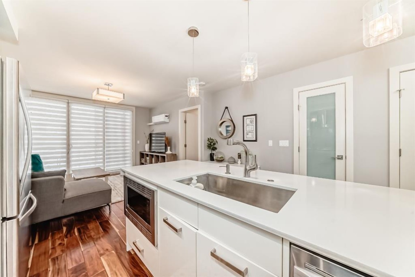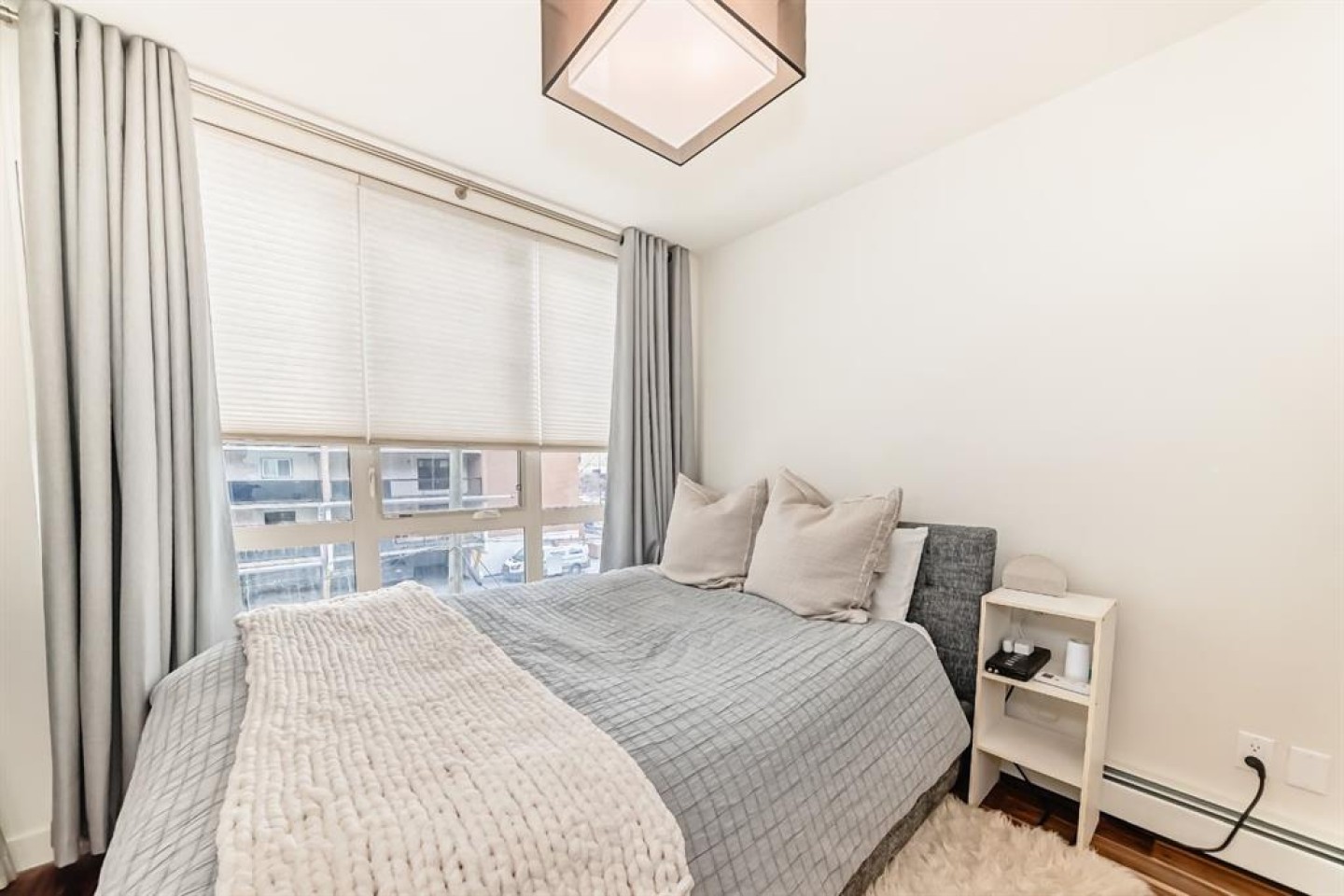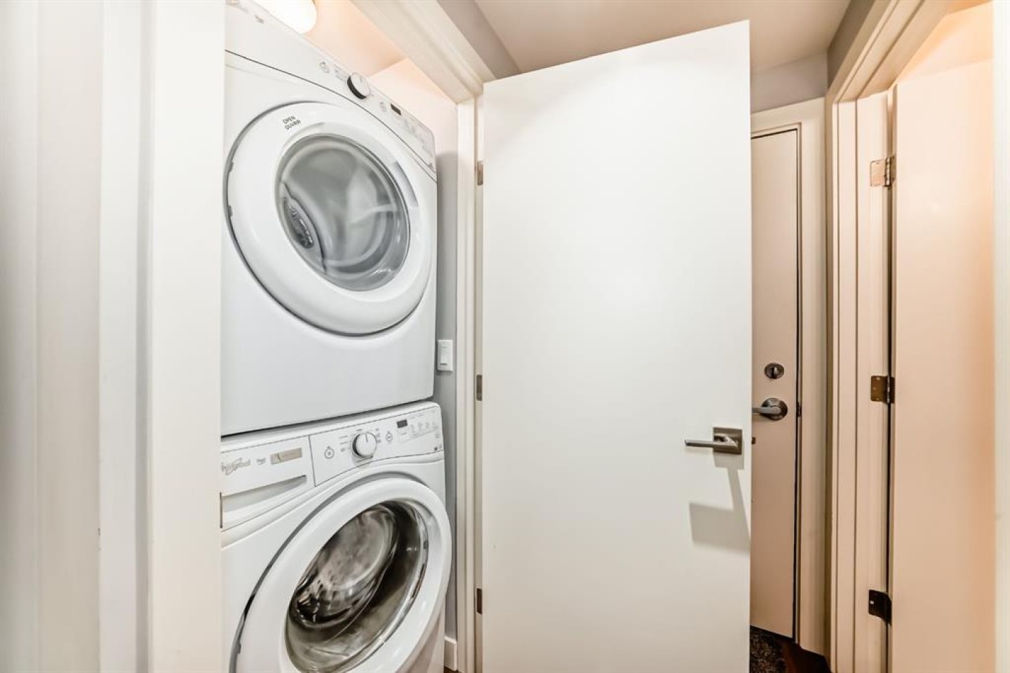 "" OPEN HOUSE: SATURDAY, MARCH 21, 2:00 - 4:00 PM. "". Excellent professional and or investor condo ((short term rentals allowed) in a prime area of Connaught/Beltline. Sunny south unit direction with air conditioning ($10000 option). Two bedroom, two full bathrooms (Ensuite and guest bathrooms), spacious living room, kitchen with dining, eating bar area, upgrade features include: quartz countertops, engineered hardwood flooring, spacious open plan, 9 foot ceilings, in suite laundry, spacious deck, one rear lot parking stall, beside rear access door. Bedroom 2 fits a bed. No exterior window and closet is in hallway. Extra storage locker in parkade area Location is close to everything downtown: restaurants, coffee shops, etc. but location is still quiet at night - away from the noise of the nightlife.