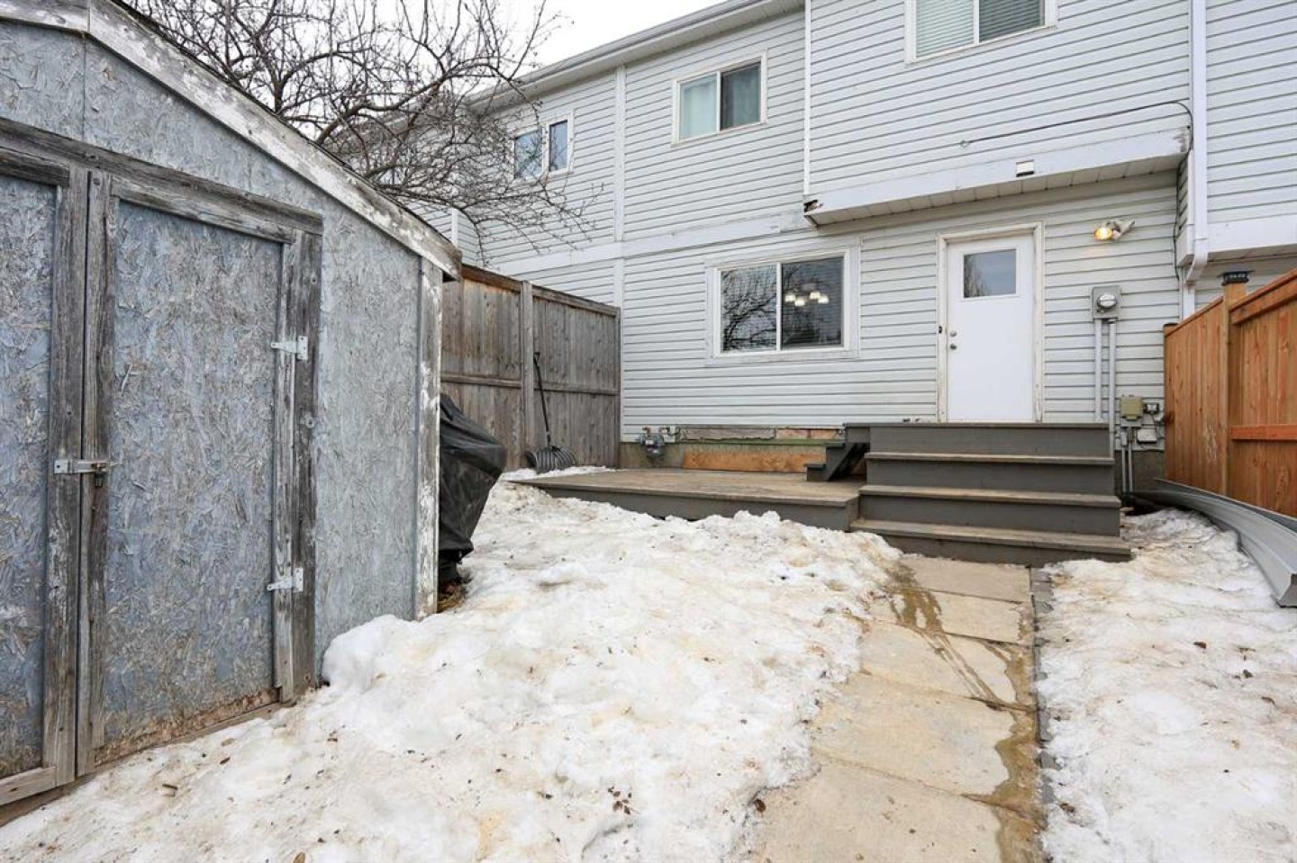IMMEDIATE POSSESSION & MOVE IN READY ~ 4 BEDROOM, 3 BATHROOM 2-STOREY TOWNHOME ~ NO CONDO FEES ~ The living room features south facing windows and a cozy gas fireplace with a brick surround and raised hearth ~ The eat-in kitchen offers plenty of dark stained cabinets, ample counter space, full tile backsplash, granite composite sink and tons of space for a dining table and chairs ~ 2 piece bath is located next to the main floor laundry and rear entry with access to the deck and backyard ~ The primary bedroom can easily accommodate a king size bed plus multiple pieces of furniture, and has dual closets ~ 2 additional bedrooms and a 4 piece bathroom with an oversized vanity complete the upper level ~ The fully finished basement was recently developed and offers a family room, 4th bedroom, 3 piece bathroom and space for storage ~ The backyard is fully fenced, landscaped and includes a garden shed ~ Paved alley and parking pad with 2 parking stalls ~ Recent updates include paint, flooring and appliances ~ The seller is aware the roof may require replacement in the near future, and the listing price reflects this ~ Excellent location; steps to transit, parks, playgrounds, walking trails, sports courts and a community hall, easy access to schools, shopping and all other amenities.