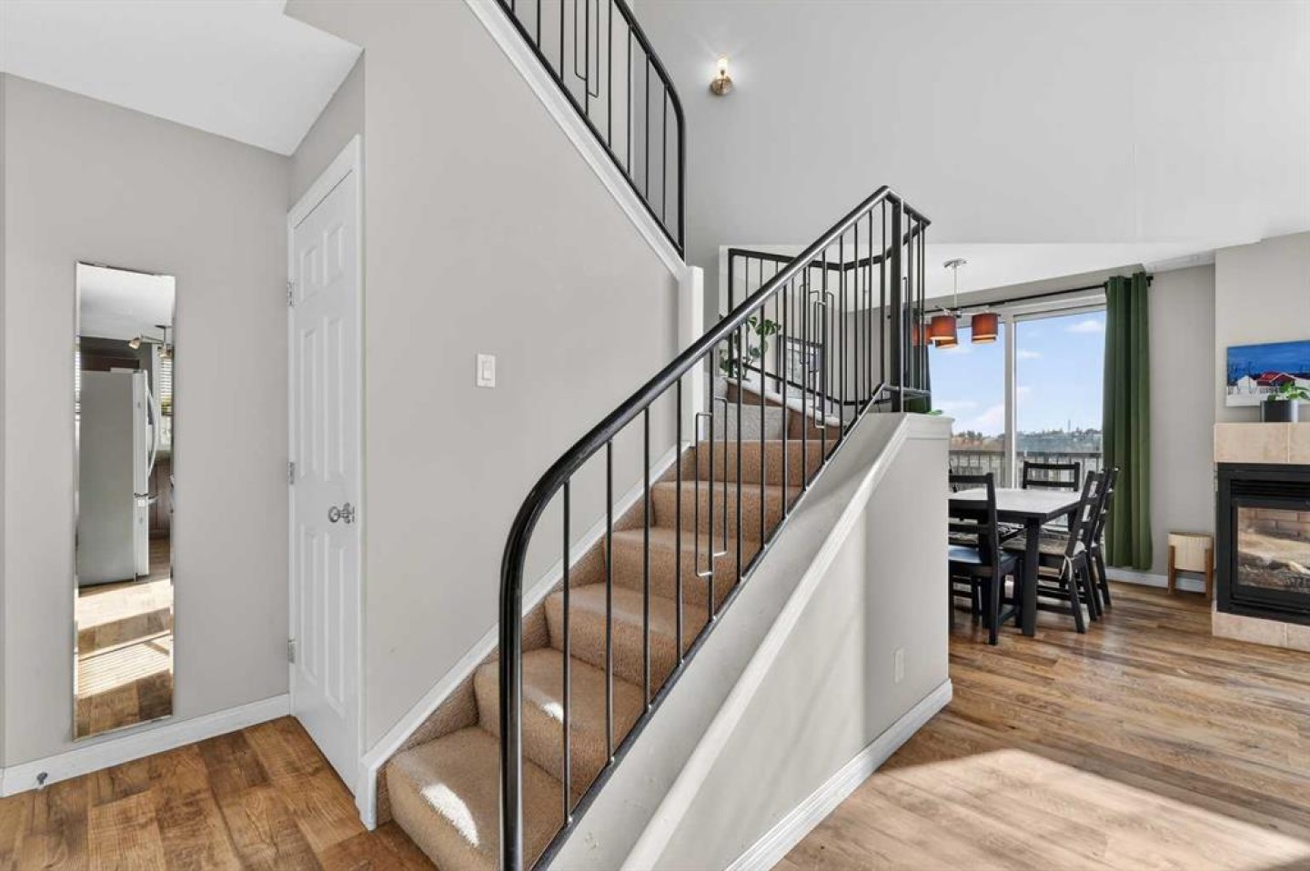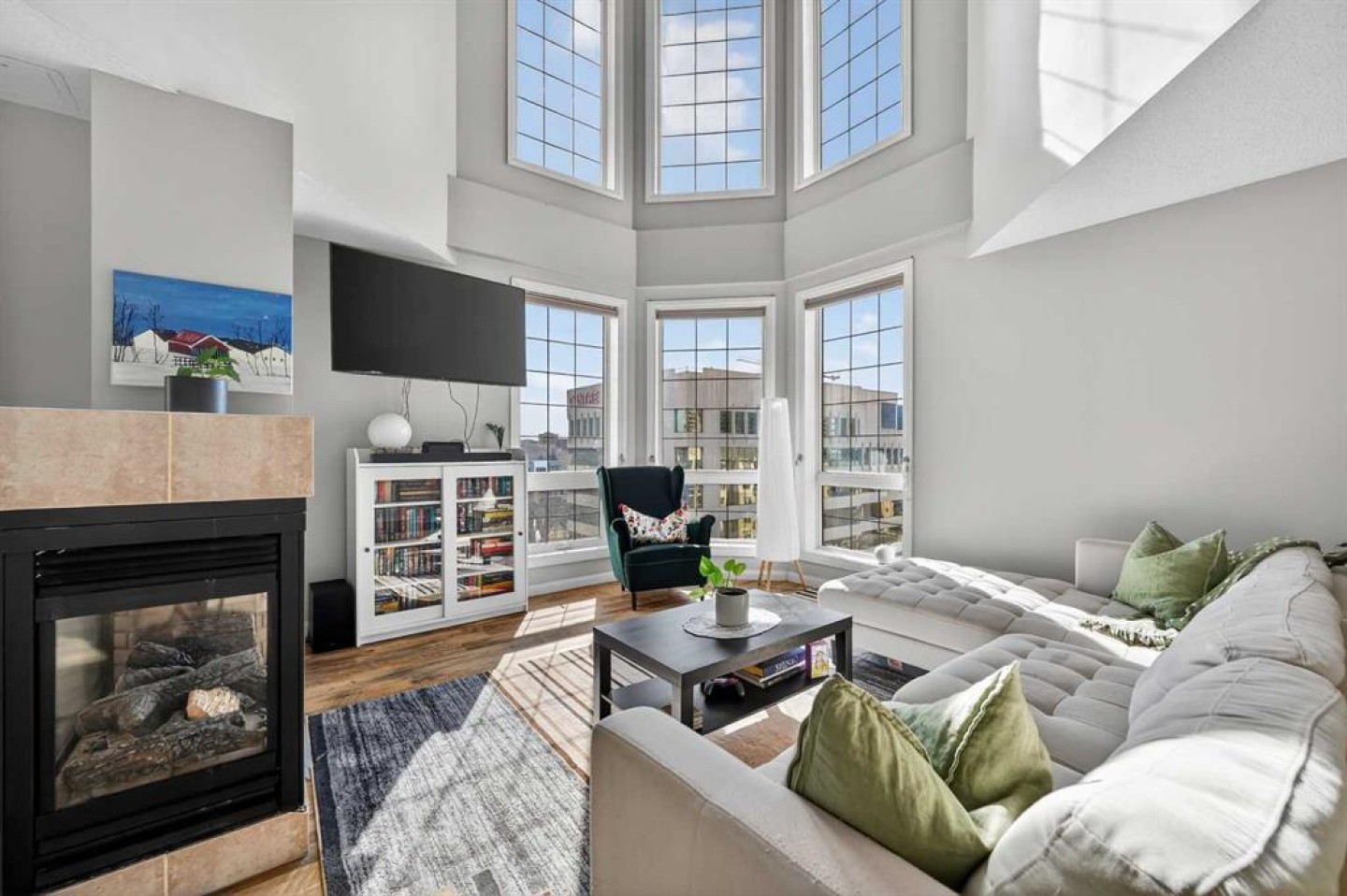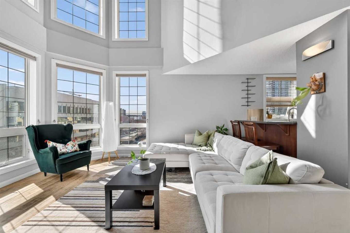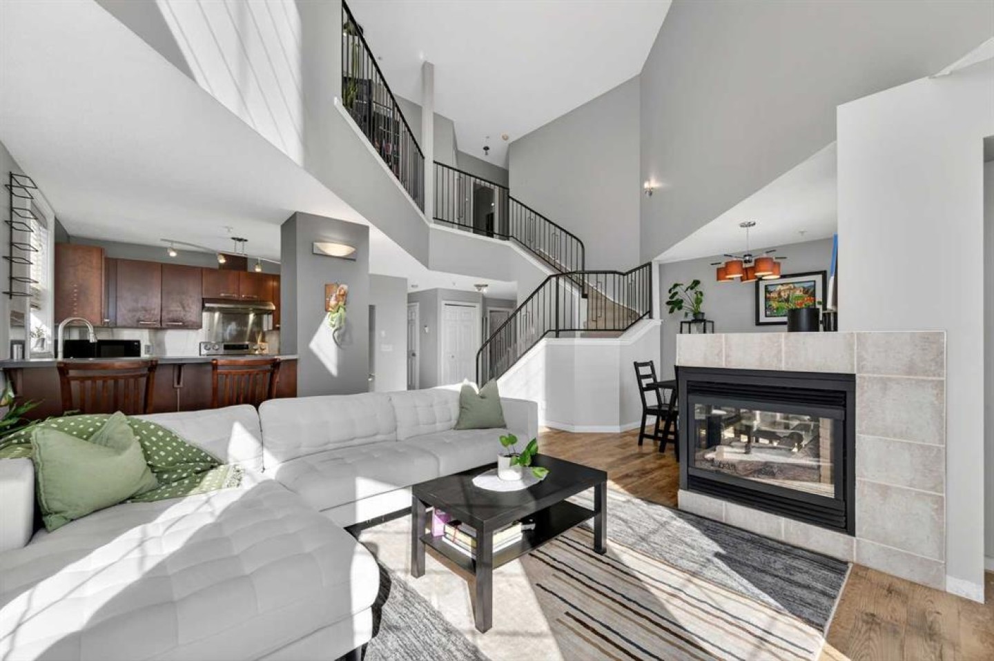 18-foot ceilings. Two outdoor spaces. Downtown views that don’t get old. This 2-storey penthouse stands out the moment you walk in. Two-storey windows and southwest exposure flood the living space with natural light, while views stretch across downtown to the north and west. Remote blinds add comfort and control throughout the day. The living room is anchored by those SW windows, with a 3-sided fireplace as the finishing touch—creating a space that feels both open and inviting. The kitchen features stainless steel appliances, dark-stained maple cabinetry, and a raised eating bar—perfect for entertaining or everyday living. The main floor also offers a spacious second bedroom with cheater access to a 4-piece bathroom—ideal for guests, roommates, or flexibility. Upstairs, the primary bedroom captures its own downtown views and includes a walk-in closet and 4-piece ensuite. A loft area just outside works perfectly as a home office or reading space, with access to your upper private deck complete with a raised bar—your second outdoor space to take in the city. A rare layout that truly lives differently—ideal for a first-time buyer, investor, or inner-city lifestyle. Underground parking keeps your vehicle secure year-round, and the location puts you just steps to downtown, 17th Avenue, transit (only 2 blocks to the train), and even walking distance to Flames games.