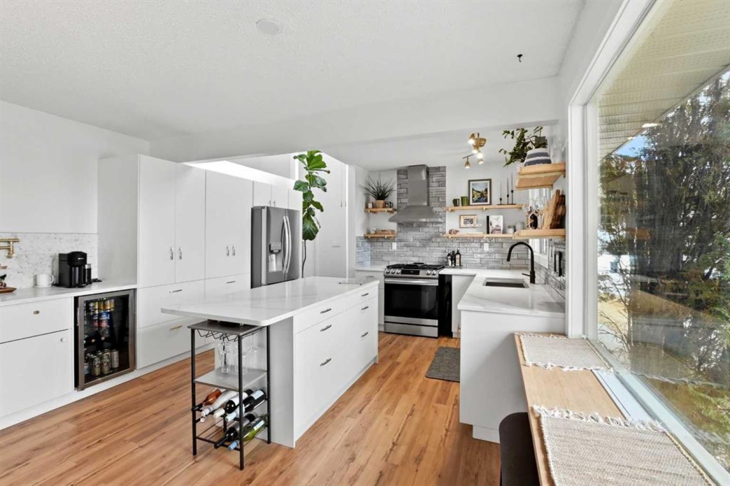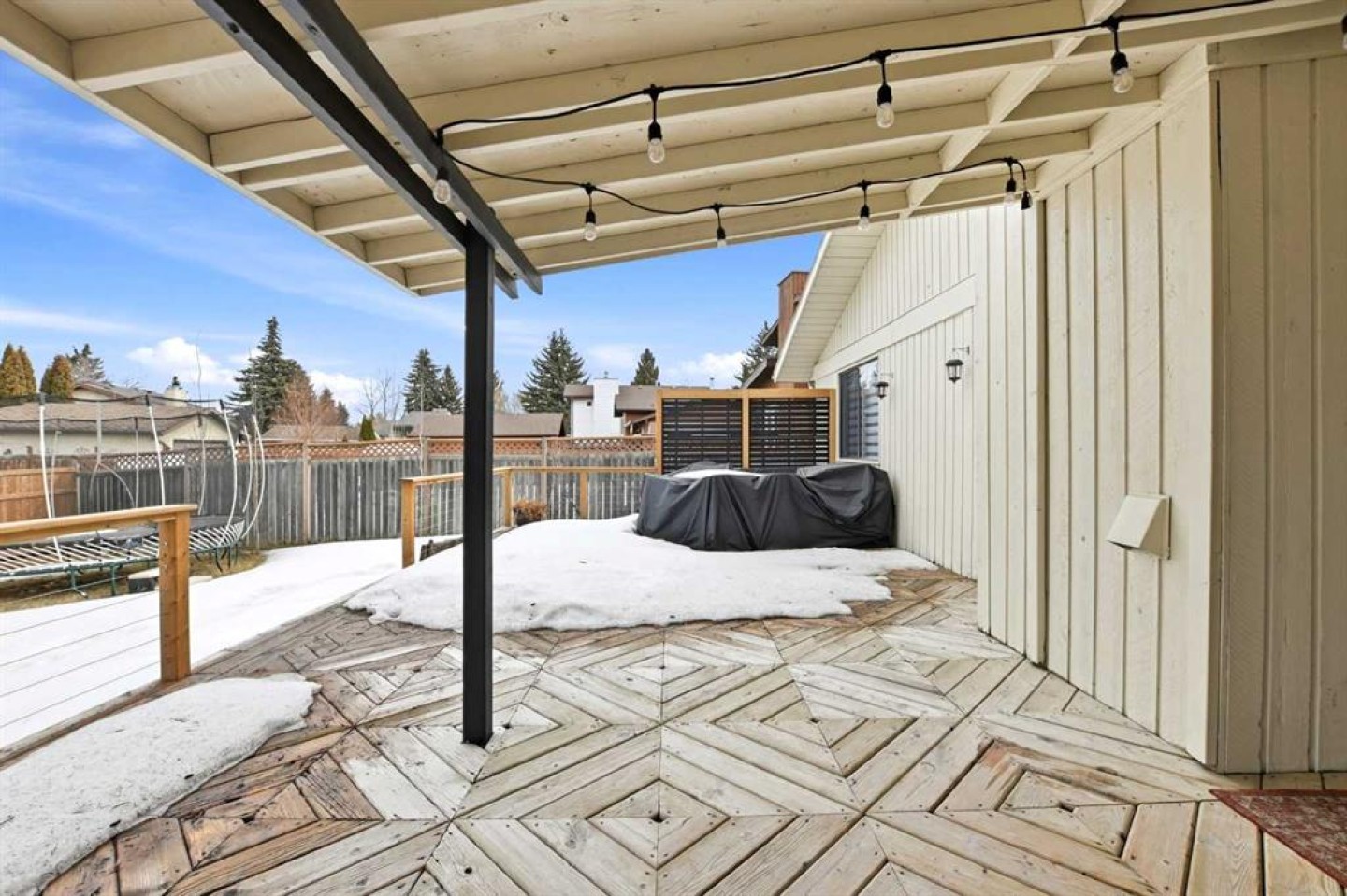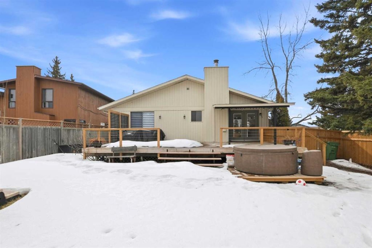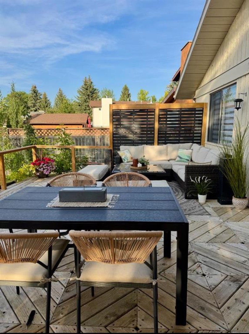 Welcome to 5 Crawford Street situated on a corner lot of a close, this home is a uniquely designed and beautifully renovated bungalow in the desirable community of Clearview Meadows, showcasing stunning mid-century modern styling. Wood-panelled vaulted ceilings and high windows fill the home with natural light and feature convenient automatic blinds. The main floor offers a sunken living room and an updated modern kitchen complete with quartz countertops, stainless steel appliances, gas range, tile backsplash, ample storage, and a centre island with seating. A stylish coffee bar includes a built-in beverage fridge and a dedicated water filler faucet perfect for topping up your favourite brewing machine! Open to the kitchen, the dining room features a cozy wood-burning fireplace and french doors leading to an expansive 2-tiered deck complete with a softtub spa, ideal for entertaining or relaxing outdoors. Vinyl plank flooring runs throughout the main level, past the convenient main floor laundry to the three bedrooms. The spacious king sized primary suite includes a walk-in closet and an updated ensuite with an oversized, low-barrier tile shower. Two nice sized bedrooms and a modern 4 piece bathroom finish off the main area. The lower level offers a large family room, 2 large bedrooms, 3 piece bathroom, plenty of storage space and an office area with built in desk. There is an attached 21’ x 23’ heated double garage for convenience, air conditioning for comfort, main floor living for accessibility, renovated for style, and a mature neighbourhood – this house has it all.