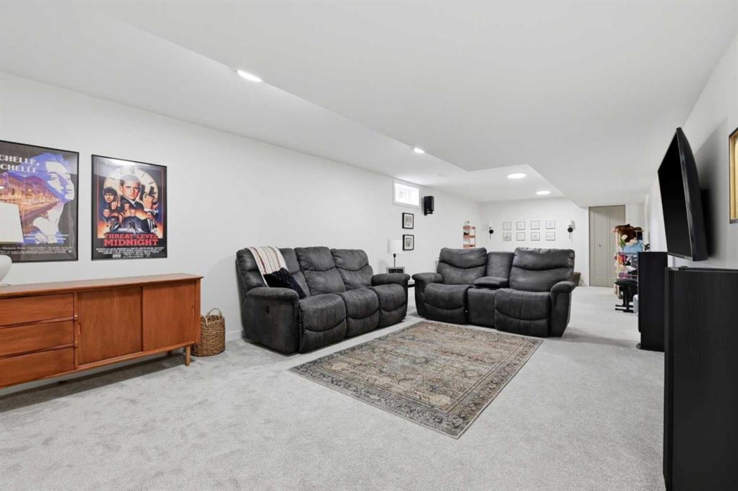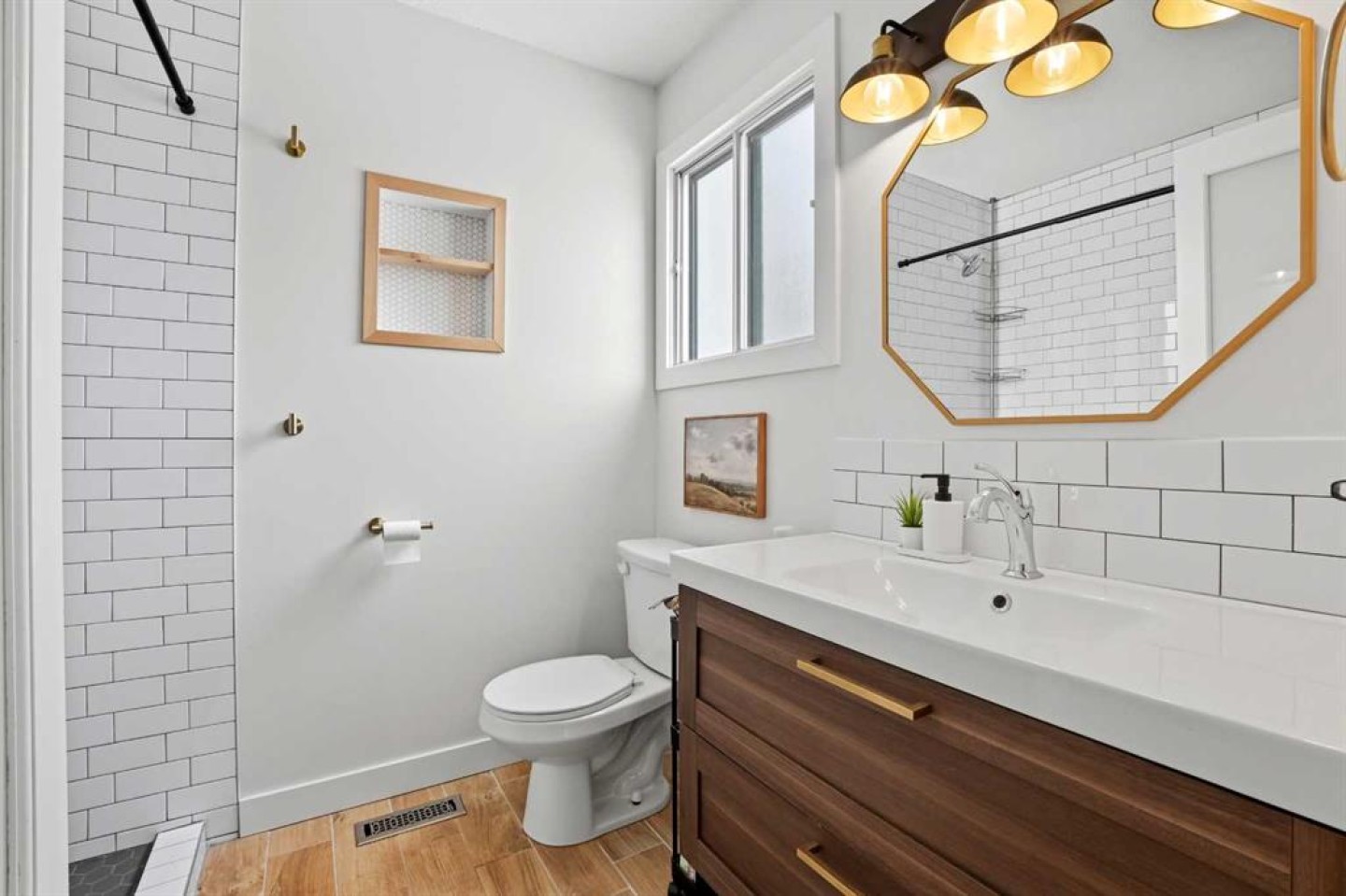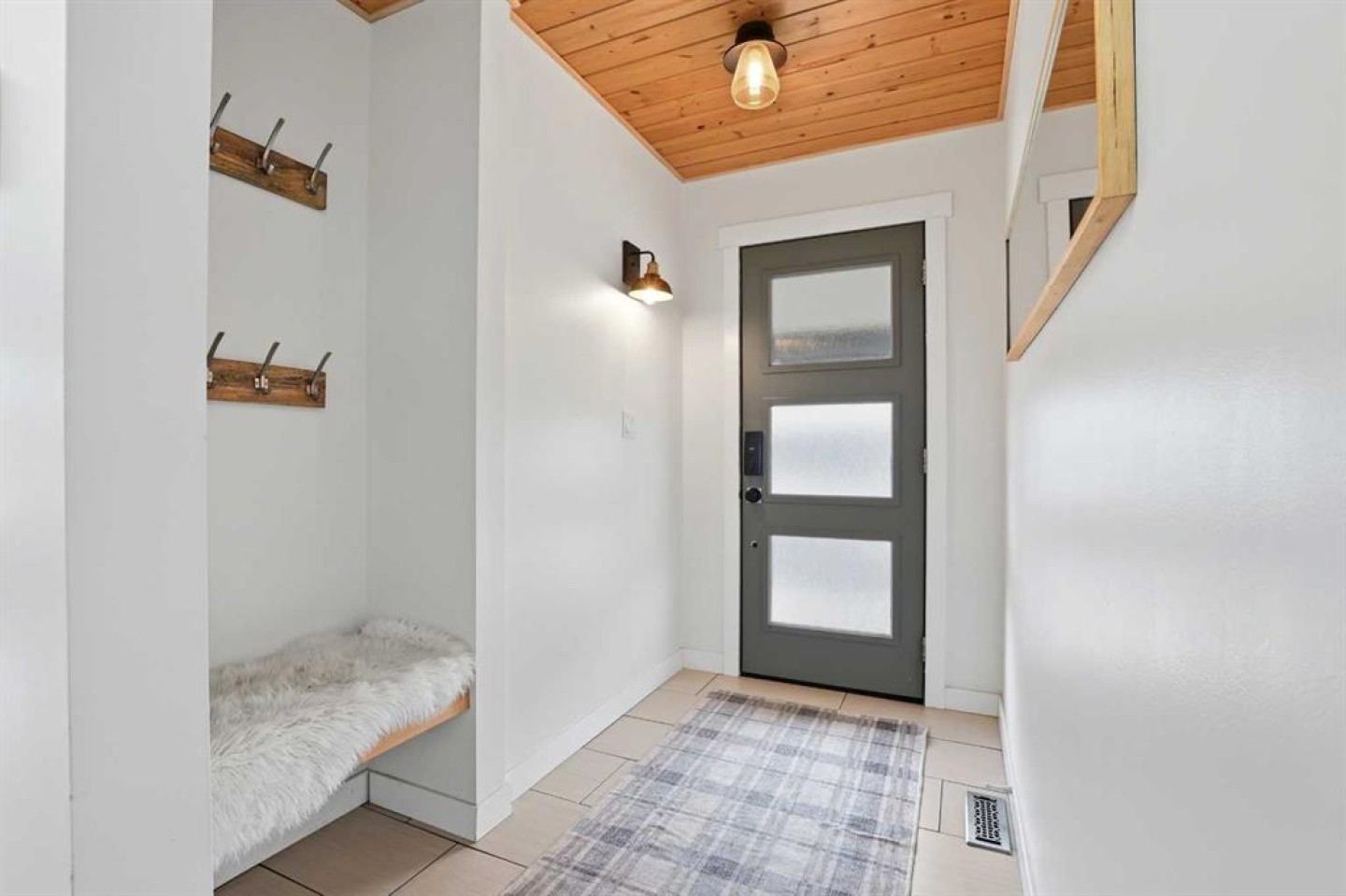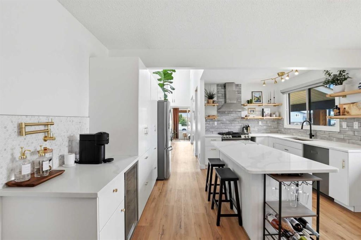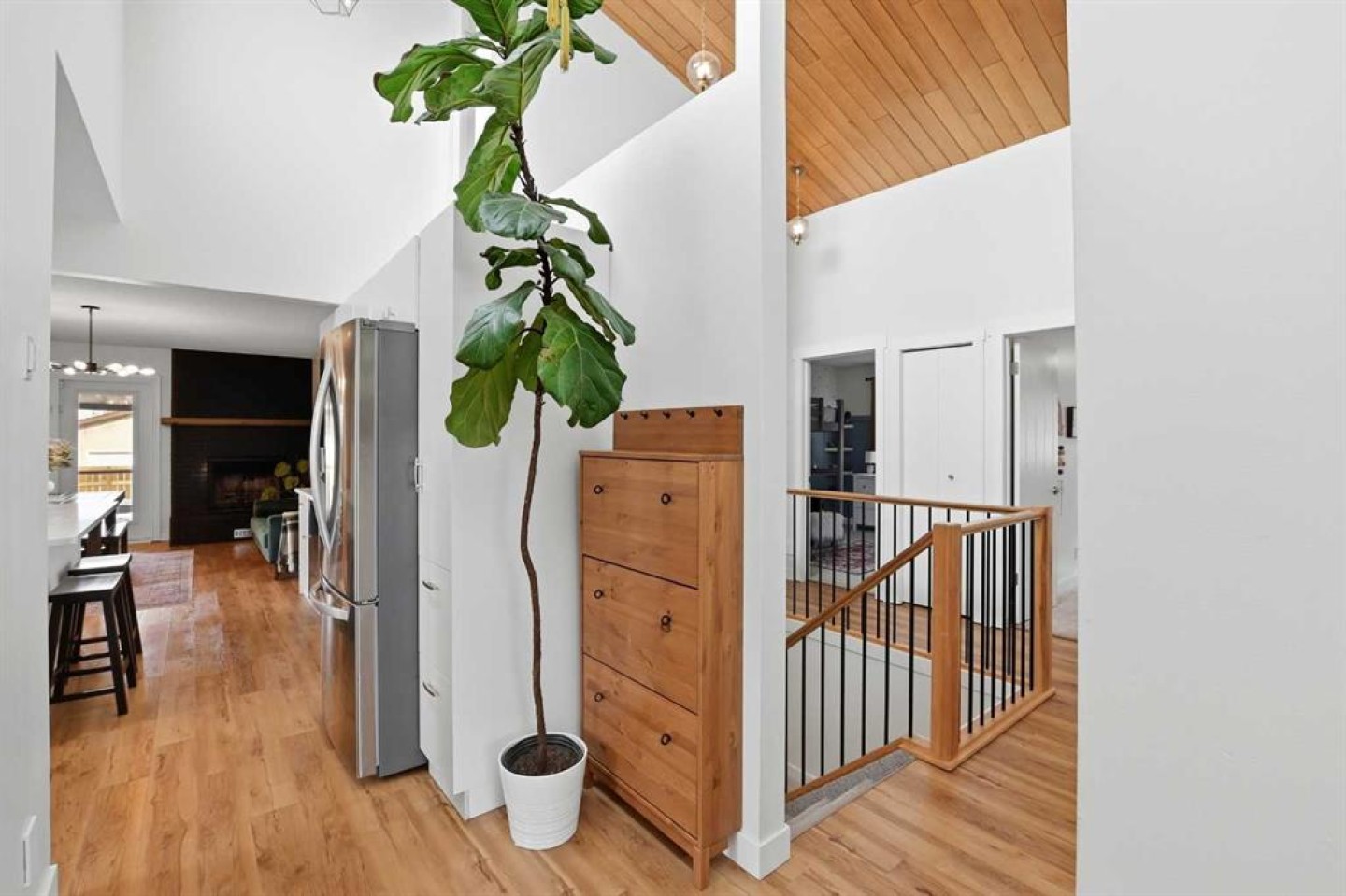 Welcome to 5 Crawford Street situated on a corner lot of a close, this home is a uniquely designed and beautifully renovated bungalow in the desirable community of Clearview Meadows, showcasing stunning mid-century modern styling. Wood-panelled vaulted ceilings and high windows fill the home with natural light and feature convenient automatic blinds. The main floor offers a sunken living room and an updated modern kitchen complete with quartz countertops, stainless steel appliances, gas range, tile backsplash, ample storage, and a centre island with seating. A stylish coffee bar includes a built-in beverage fridge and a dedicated water filler faucet perfect for topping up your favourite brewing machine! Open to the kitchen, the dining room features a cozy wood-burning fireplace and french doors leading to an expansive 2-tiered deck complete with a softtub spa, ideal for entertaining or relaxing outdoors. Vinyl plank flooring runs throughout the main level, past the convenient main floor laundry to the three bedrooms. The spacious king sized primary suite includes a walk-in closet and an updated ensuite with an oversized, low-barrier tile shower. Two nice sized bedrooms and a modern 4 piece bathroom finish off the main area. The lower level offers a large family room, 2 large bedrooms, 3 piece bathroom, plenty of storage space and an office area with built in desk. There is an attached 21’ x 23’ heated double garage for convenience, air conditioning for comfort, main floor living for accessibility, renovated for style, and a mature neighbourhood – this house has it all.