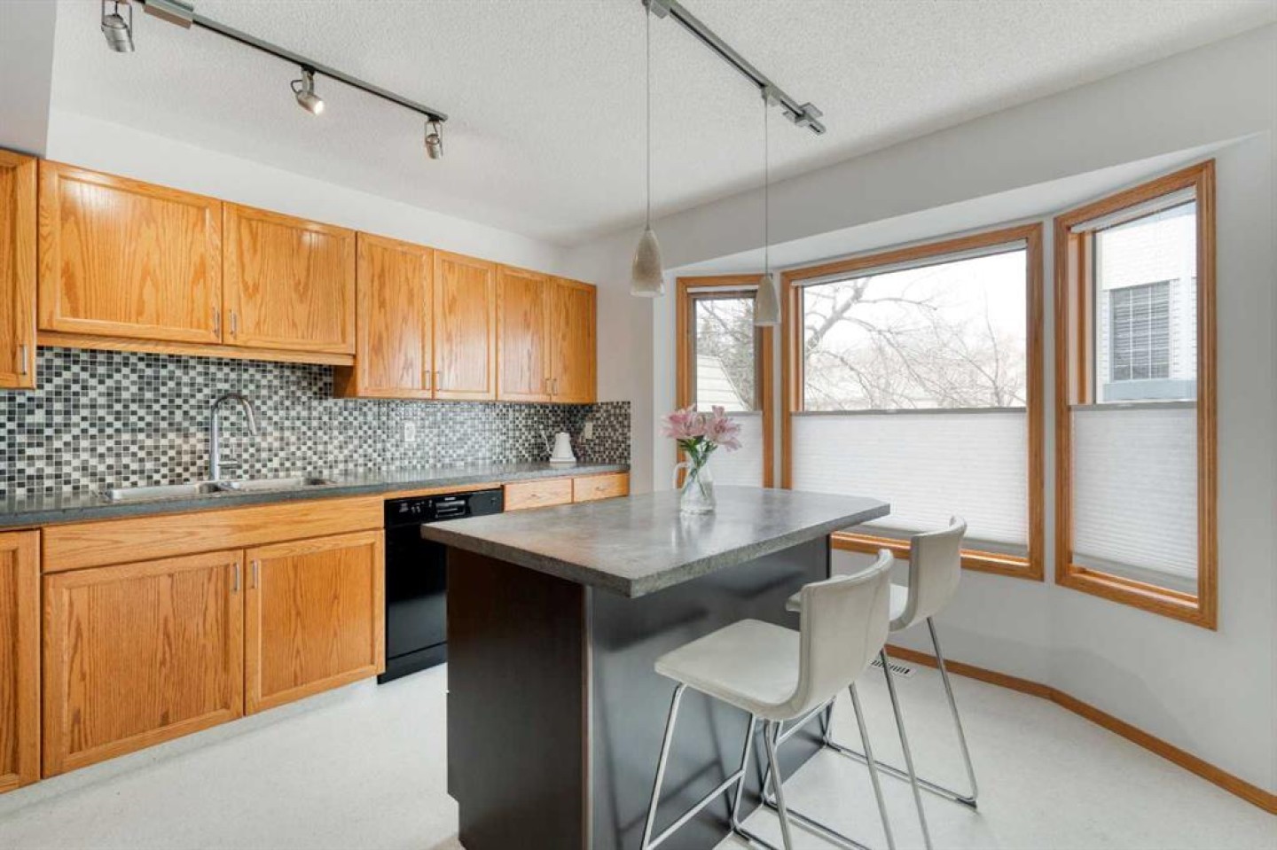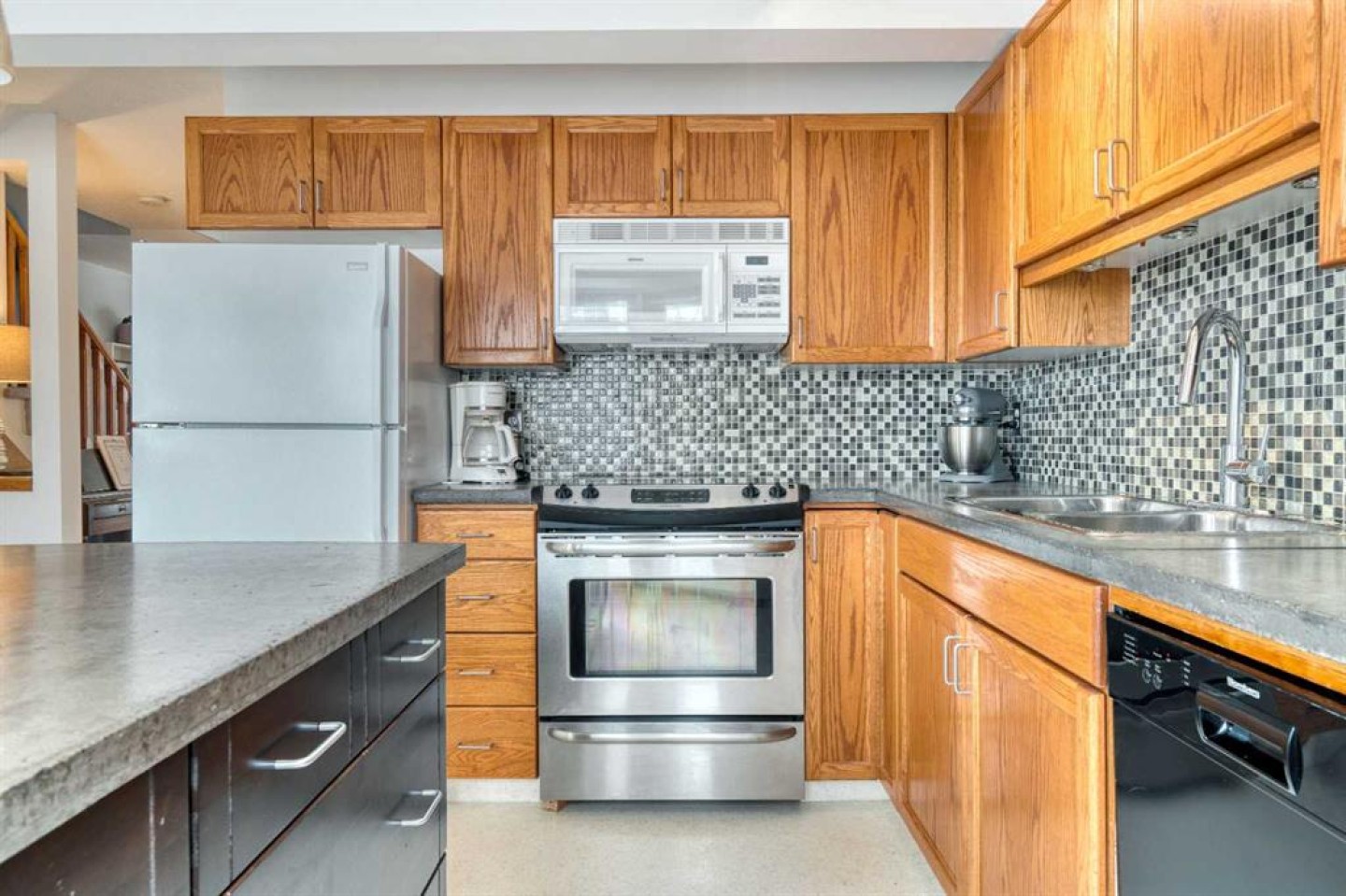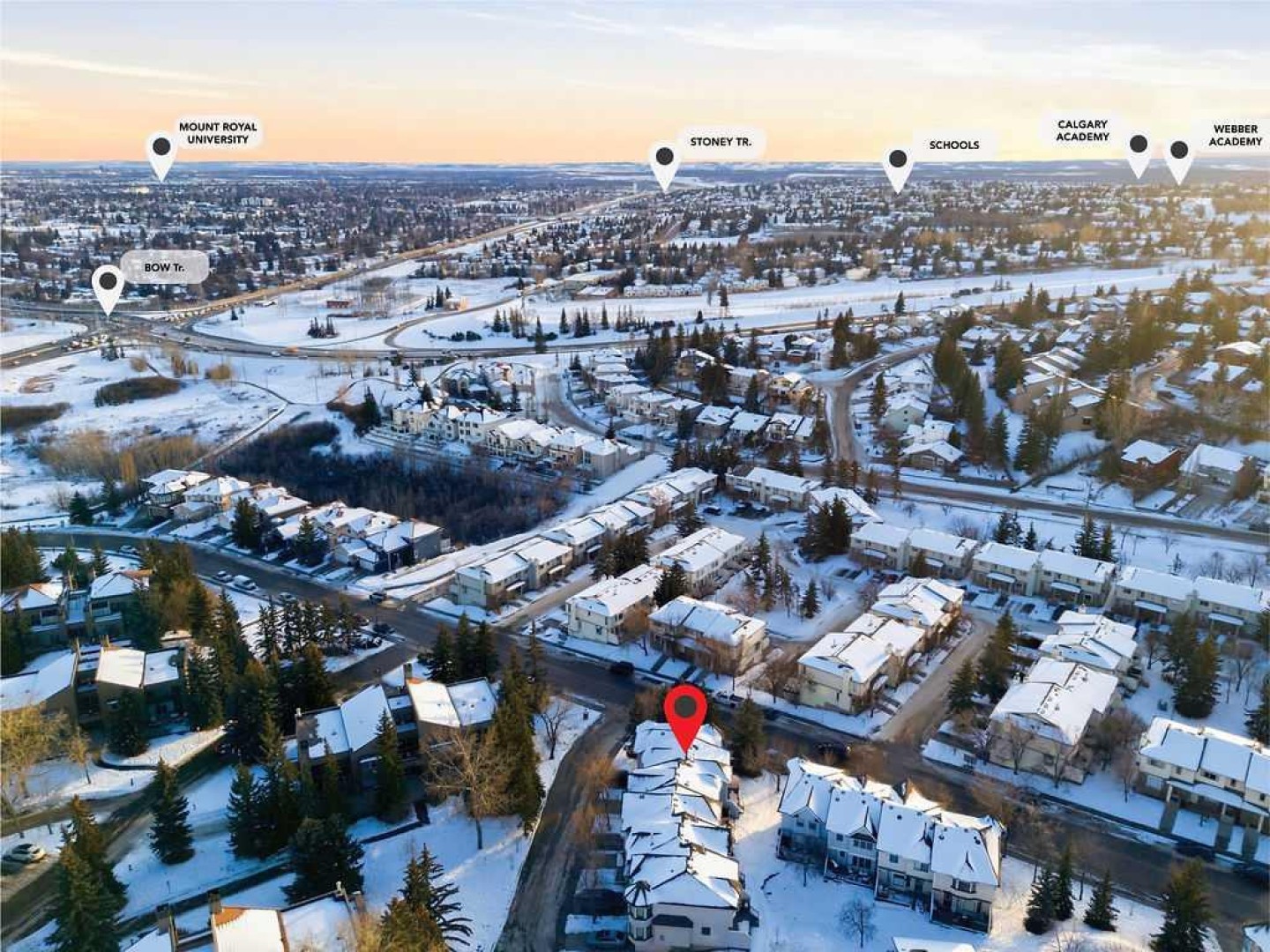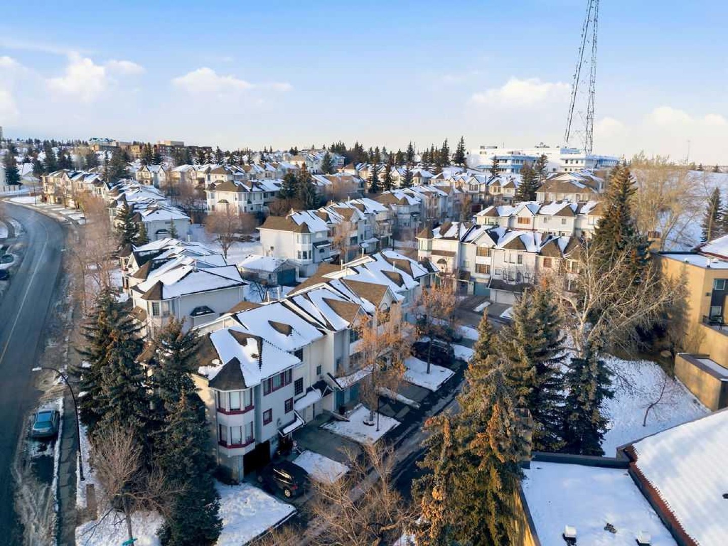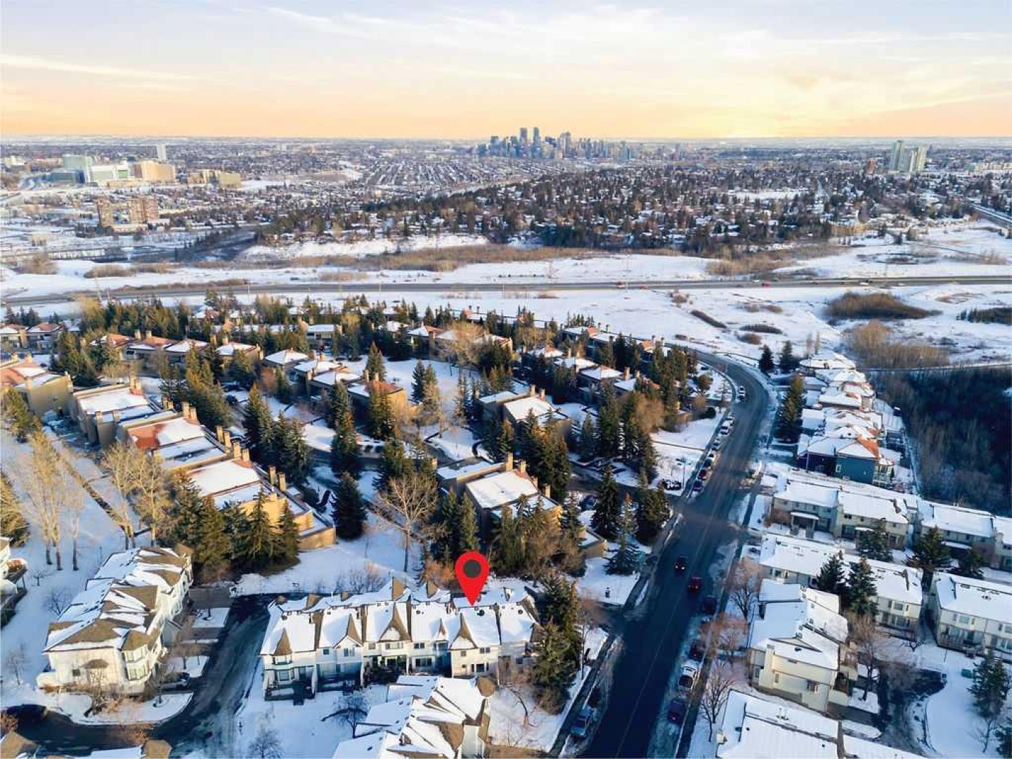 Welcome to 5 Patina Point SW, a tastefully updated 2 bedroom, 1.5 bath townhome offering 1,340 sq. ft. of comfortable living space in the highly desirable community of Patterson on Broadcast Hill. Surrounded by mature trees, abundant green spaces, and sweeping city views from the community, this location offers the perfect balance of convenience and nature right outside your front door. Step inside to a functional foyer entry that leads up to the open concept main living area, where you’ll find solid oak hardwood floors, a wall of bay windows overlooking the trees, filling the space with natural light, and a cozy gas fireplace offering an inviting setting for relaxing evenings or hosting family and friends over the holidays. The updated kitchen features oak cabinetry, custom concrete countertops, a generous island, and direct access to the private back deck overlooking a green space the ideal spot for morning coffees or warm summer dinners. Upstairs, you'll find a very large primary bedroom with a custom feature wall, a second well-sized bedroom, and an updated 4-piece bathroom complete with a large corner soaker tub. A bright loft area offers the perfect spot for a home office, reading nook, or additional family lounge space. The attached double garage provides secure parking for two vehicles plus a driveway stall, making parking effortless and storage abundant, a rarity with inner city living! Perfectly positioned just steps from transit, minutes to downtown, and with easy access to the mountains, this townhome offers an unbeatable lifestyle and value. Don’t miss your chance to own in one of Calgary’s most sought after communities!