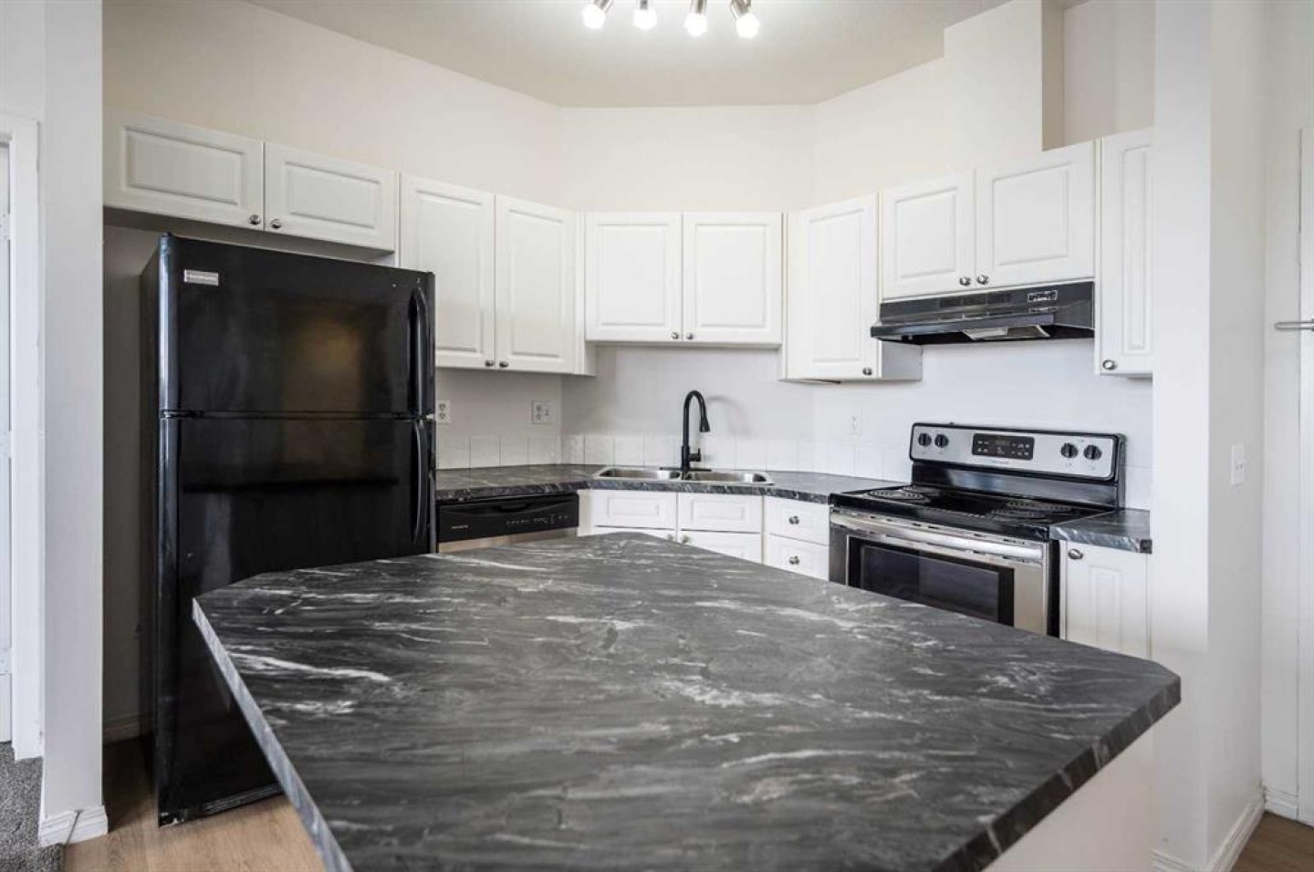 Dishwasher, Electric Range, Range Hood, Refrigerator, Washer/Dryer Stacked