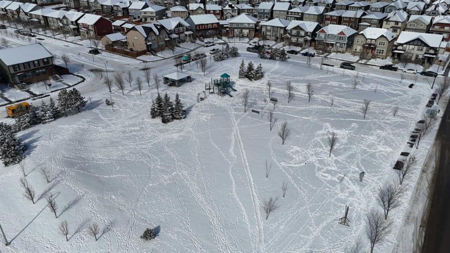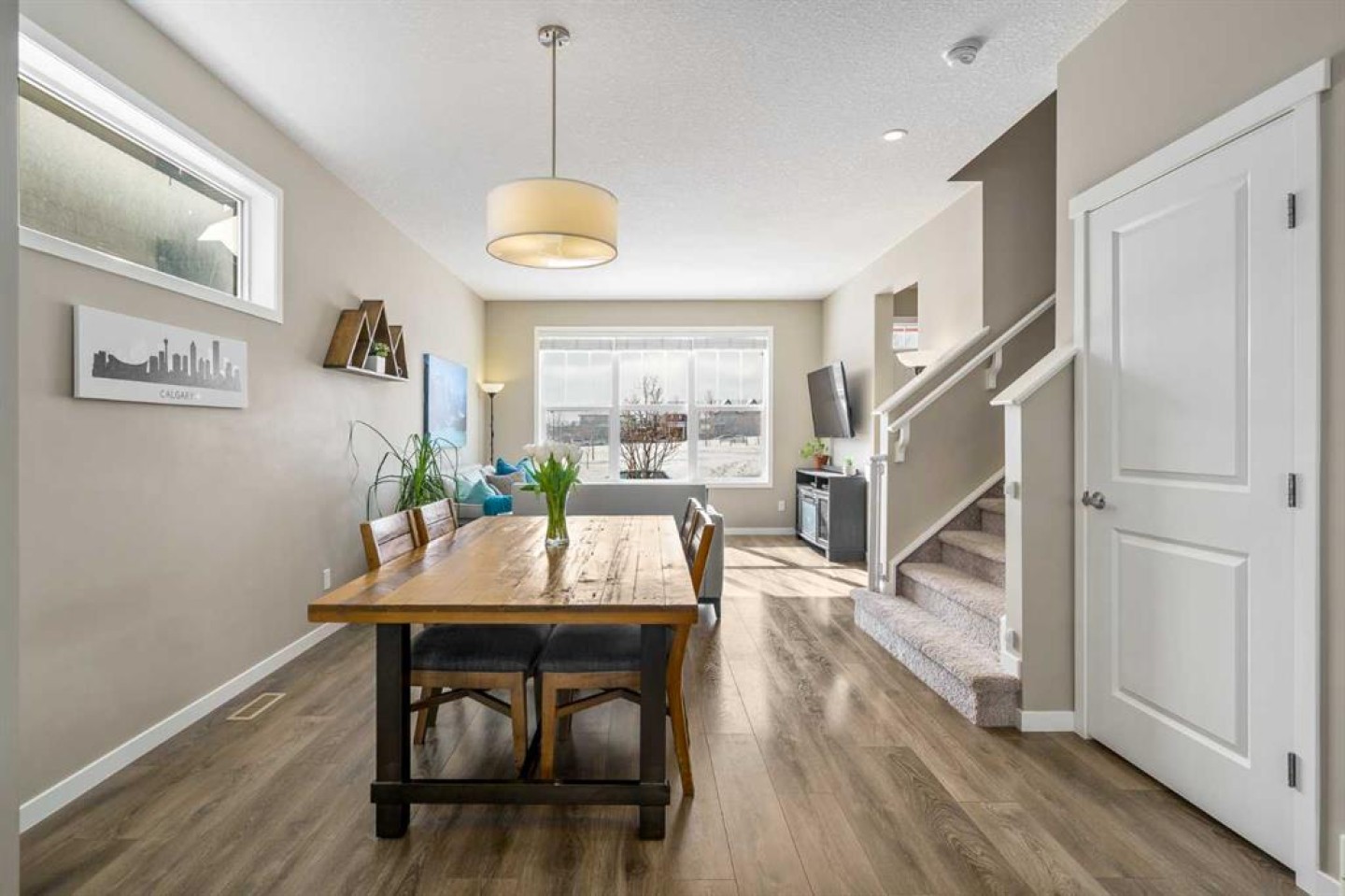 ** OPEN HOUSE CANCELLED** Welcome to this beautifully maintained, two storey attached home, ideally positioned in one of Mahogany’s most desirable settings. Unlike many attached homes along the boulevard, this property enjoys a premium location on the square, where homes wrap around a charming central green space with a playground at its heart. This park-front setting creates a wonderful sense of community and provides a safe and inviting place for kids to play while neighbours gather and connect—perfect for young families or downsizers alike. From the moment you arrive, the south facing exposure (but don't worry A/C will keep you cool all summer long) and peaceful park views create an exceptional first impression. Inside, the home offers a thoughtful and functional layout designed for everyday living. Just off the front entrance, the spacious front living room is filled with natural light thanks to a large south-facing window and enjoys beautiful views of the park across the square. Laminate flooring runs throughout the main level, creating warmth and continuity throughout the space. The centrally positioned dining area connects the living room and kitchen, offering a comfortable setting for family meals or hosting friends, while the transom window above brings additional light into the heart of the home. At the back of the home, the kitchen is both stylish and practical, featuring grey cabinetry extended to the drop-down ceiling, stainless steel appliances, a hammered brick-laid subway tile backsplash, stand-alone hood fan, pantry closet, and a convenient "burger pass" through by the back entry that is perfect for unloading groceries or passing out BBQ essentials with ease. The rear entrance also includes a 2-piece bathroom, coat closet, and access to the spacious backyard with parking pad & firepit, perfect for those long summer nights. Upstairs you’ll find three bedrooms including two kids’ or guest rooms at the back, a full 4-piece bathroom, convenient laundry closet (laundry currently downstairs), and a spacious primary retreat at the front of the home. The primary bedroom offers a walk-in closet, private 3-piece ensuite, and peaceful views overlooking the park and playground across the square. The fully finished basement adds even more flexibility, featuring a large recreation space currently used for a home-based business but easily suited for a home gym, media room, kids’ play space, or additional family room. Location is another standout feature of this home. Just down the street is the vibrant East Mahogany Marketplace and of course the Urban Village in central Mahogany, where you’ll find an impressive mix of restaurants, cafés, shops, and everyday conveniences including Sobeys, Shoppers Drug Mart, Tim Hortons, banks, fitness studios, professional services, and more. And of course, this is Mahogany, Calgary’s premier lake community, offering an incredible four-season lifestyle centred around its beautiful freshwater lake.