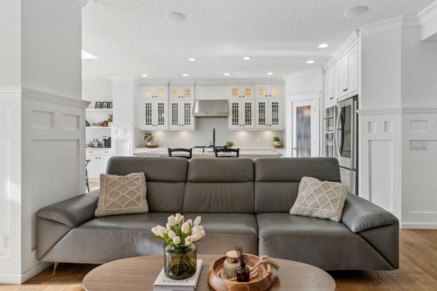 Location? Unbeatable. Custom Upgrades? Endless. This impressive home offers over 3,100 sq.ft. of fully finished living space in one of the most desirable areas of Mahogany. Just minutes from Mahogany West Beach, this property combines convenience, lifestyle, and quality craftsmanship throughout. Positioned on a quiet street directly across from a large green space and park, the home also provides incredibly easy access in and out of the community. Step inside and you’ll quickly see this is far from a typical home. Built with numerous custom features, the main floor showcases beautiful wainscotting, crown moulding, built-in shelving, and wide plank engineered flooring. The inviting living room with a gas fireplace flows into a spacious dining area perfect for entertaining. The dining space is highlighted by a skylight overhead that fills the room with an abundance of natural sunlight, creating a bright and welcoming atmosphere throughout the day. French doors off the dining room lead to the low-maintenance backyard, creating a seamless indoor-outdoor living space. The kitchen is designed to impress with a massive island offering additional seating, quartz countertops, stainless steel appliances, a smart fridge, corner pantry, and abundant cabinet and counter space. A charming beverage station complete with a wine fridge adds the perfect touch for morning coffee or evening drinks. Upstairs, the bright and open layout features a large primary retreat with a walk-in closet and a luxurious 5-piece ensuite with double vanities, glass shower, and relaxing soaker tub. Two additional spacious bedrooms—one with its own private balcony—plus a full bathroom and versatile flex space provide ideal room for a home office, kids’ play area, or additional lounge space. The fully finished basement continues to impress with 9-foot ceilings, a generous fourth bedroom with built-in wardrobes, and a beautifully finished 3-piece bathroom featuring heated floors, under-cabinet lighting, and a large glass shower. The cozy TV area with a second fireplace creates the perfect space for movie nights. The oversized heated garage with epoxy flooring is fully finished—perfect for storage, hobbies, or the ultimate man cave. Outside, the private backyard features mature trees along with upper and lower decks offering multiple seating areas to relax and entertain. With the lake, parks, and walking paths just steps away, this exceptional home offers the very best of lake community living in Mahogany. Your dream home awaits—schedule your private showing now!
