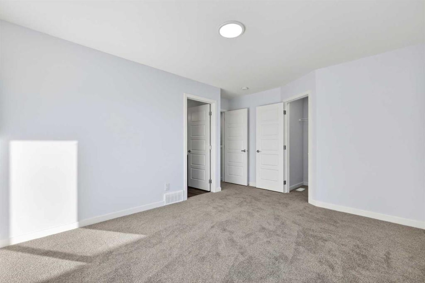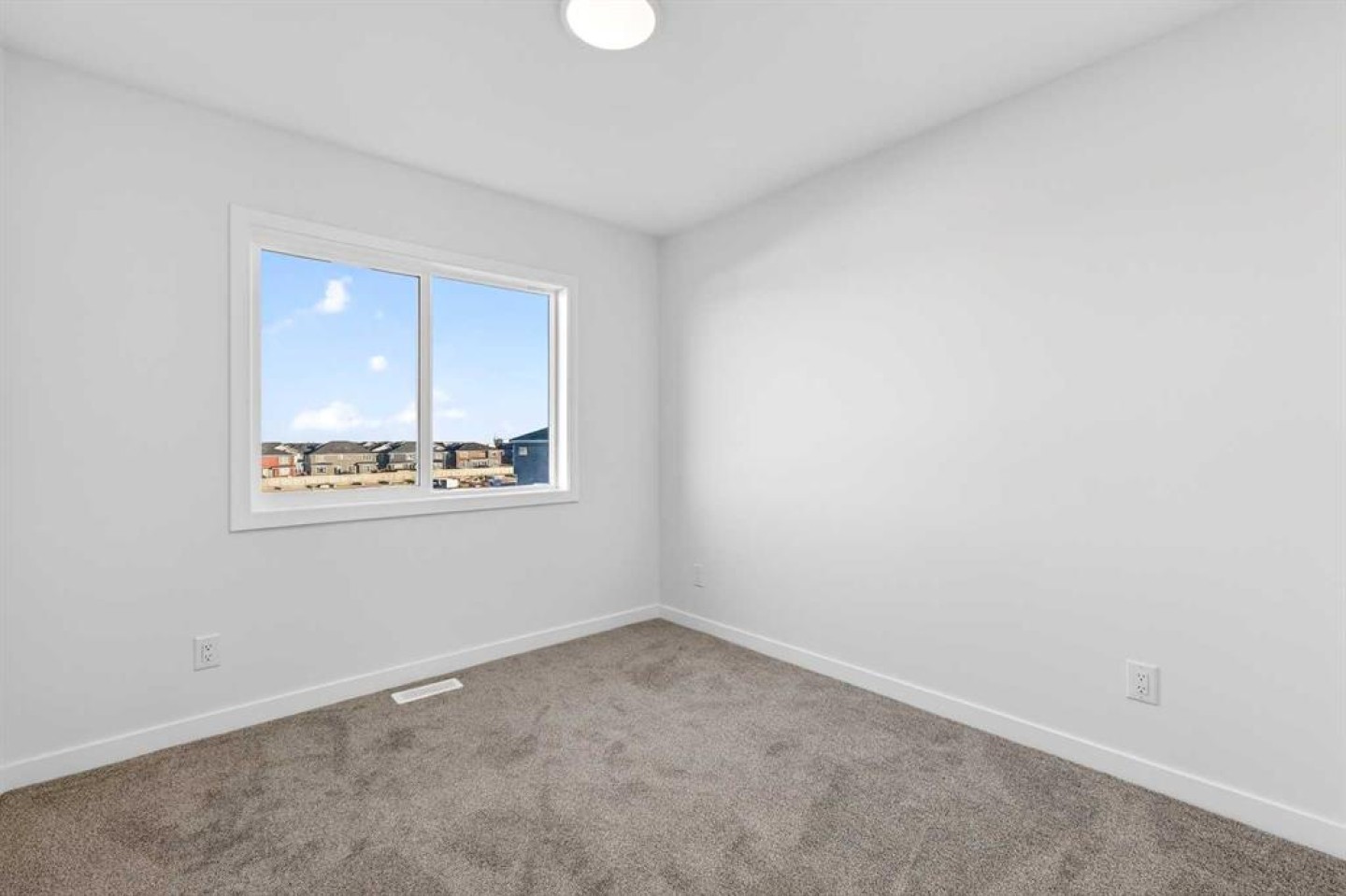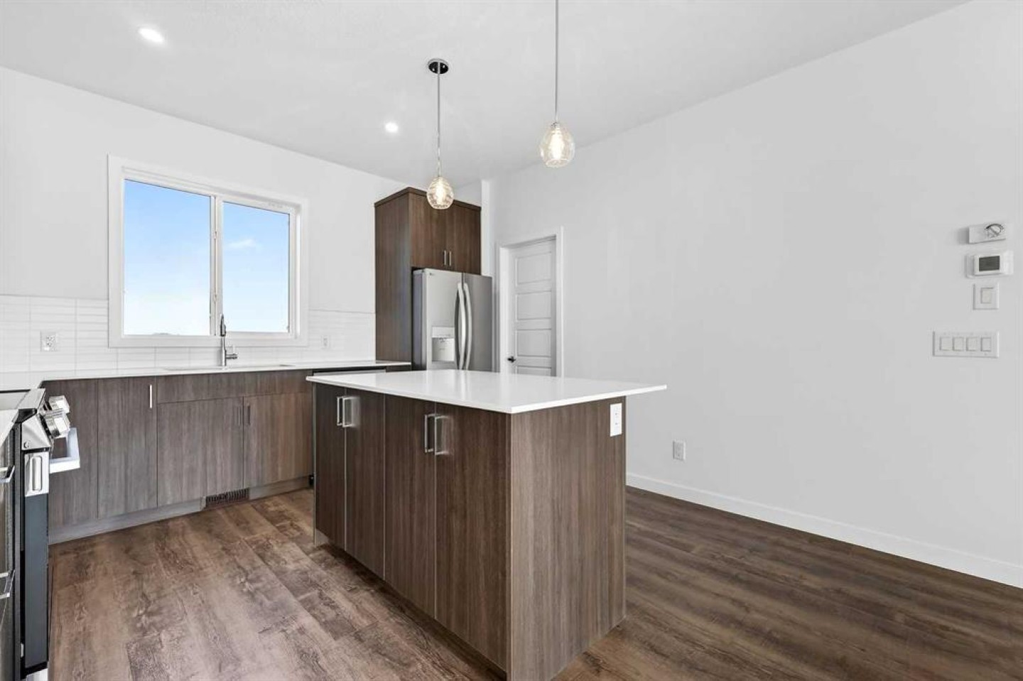 StreetSide proudly presents this exceptionally popular interior-unit townhome, where expansive living areas meet modern comforts and sophisticated finishes. The thoughtfully designed floorplan features three spacious upper-level bedrooms and two and a half well appointed bathrooms, complemented by a versatile lower-level den perfect for a home office or quiet retreat. The heart of the home is an inviting open-concept main floor, anchored by a large gourmet kitchen featuring a functional breakfast bar for casual dining. This bright living space transitions seamlessly to a private balcony, offering a perfect setting for outdoor relaxation. The interior showcases high end craftsmanship, including modern dark slab-style cabinetry with a full bank of drawers for maximum storage. The kitchen is further elevated by polished white quartz countertops and a full suite of premium stainless steel appliances. Durable luxury vinyl flooring runs throughout the primary living areas, while the stairs and upper level are finished with plush carpet over an 8lb underlay for superior comfort. Additional conveniences include an attached double car garage, professionally maintained landscaping, and a lifestyle defined by maintenance free living. Located within Red Embers Point East, this home places you at the heart of the dynamic Redstone neighborhood. Enjoy the ease of a convenient location with quick access to major routes, including Stoney Trail, ensuring you are never far from the city's best. The community is strategically positioned near future commercial developments, promising shops, services, dining, and entertainment options just moments from your doorstep.