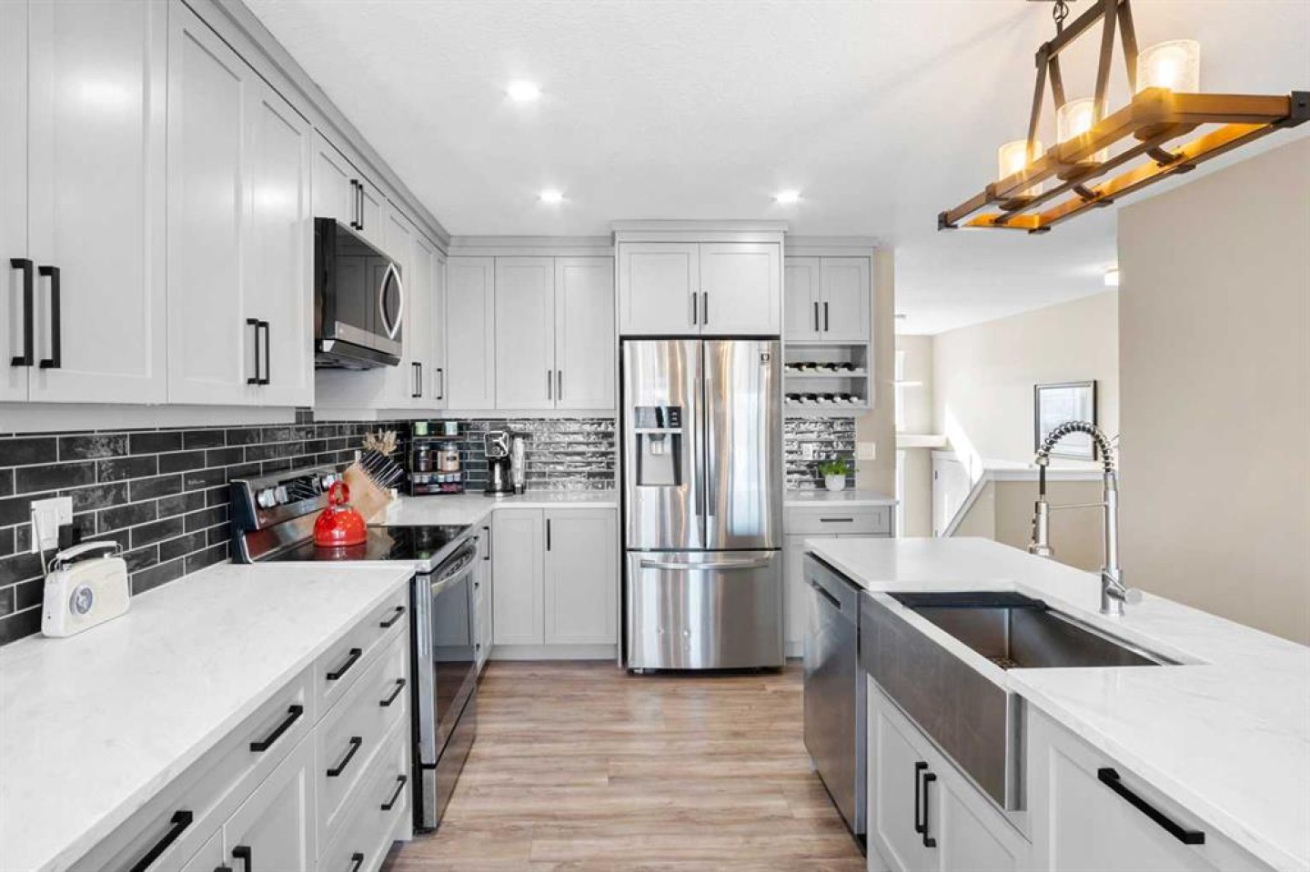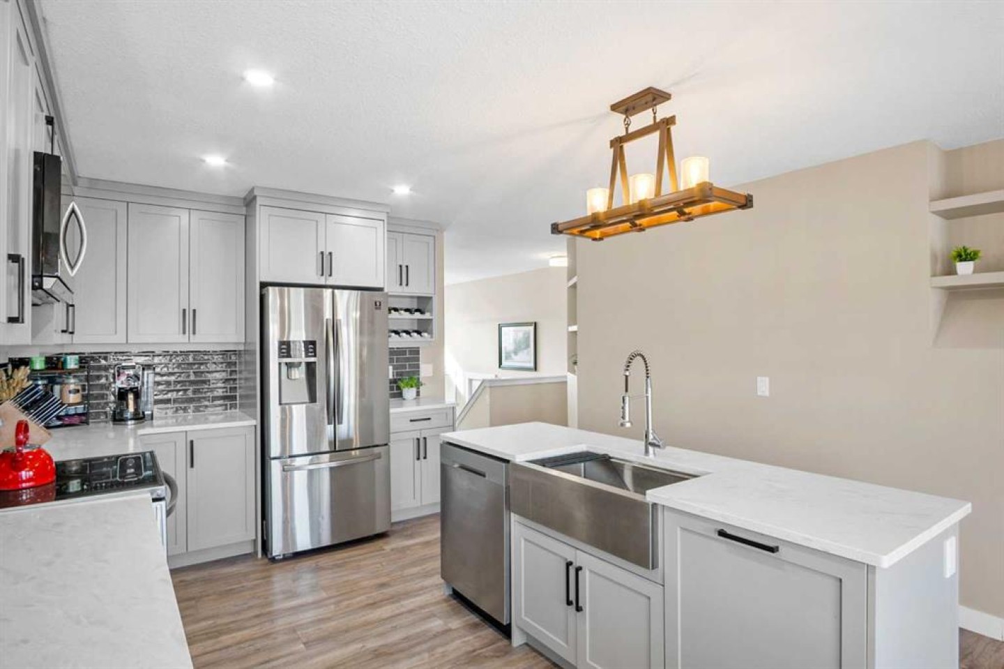 Welcome to this 5 BEDROOM beautifully updated and FULLY FINISHED 5-BEDROOM HOME offering a bright, open design and exceptional functionality for families of all sizes. From the moment you arrive, you are greeted by a spacious front entry filled with natural light, leading up a wide staircase into an inviting OPEN-CONCEPT main living area. The heart of the home is the stunning, BRAND NEW KITCHEN (2025) featuring modern cabinetry, new appliances & a functional ISLAND all flowing seamlessly into the dining area with access to the deck and the warm, welcoming living room complete with a gas fireplace. FRESH PAINT, FLOORING & UPDATED BATHROOMS (2025) throughout the home create a clean, MOVE-IN READY feel. The main level offers three bedrooms, including a spacious primary retreat with a walk-in closet & a beautiful ensuite featuring a 6’ jetted tub. A front bedroom with a charming window makes an ideal office or den, while the second bedroom includes a good sized closet & lots of natural light. Downstairs, the FULLY DEVELOPED BASEMENT provides additional living space with a large open FAMILY ROOM, big windows for natural light, and a WOOD BURNING STOVE—perfect for cozy evenings. This level also includes two additional bedrooms, a large bathroom with a corner shower, and plenty of STORAGE. This home has seen mechanical and cosmetic updates, including a new 85-gallon hot water tank, rebuilt furnace, and washer & dryer (2023), offering peace of mind for years to come. The exterior features a FENCED YARD featuring a deck, gazebo, greenhouse, dog run, and alley access. Appreciate many different fruit trees/plants along with the GARDEN, + enjoy sunny days on the south-facing front DECK. The DOUBLE ATTACHED GARAGE is insulated and heated. Own this thoughtfully updated, spacious home that checks all the boxes—inside and out.