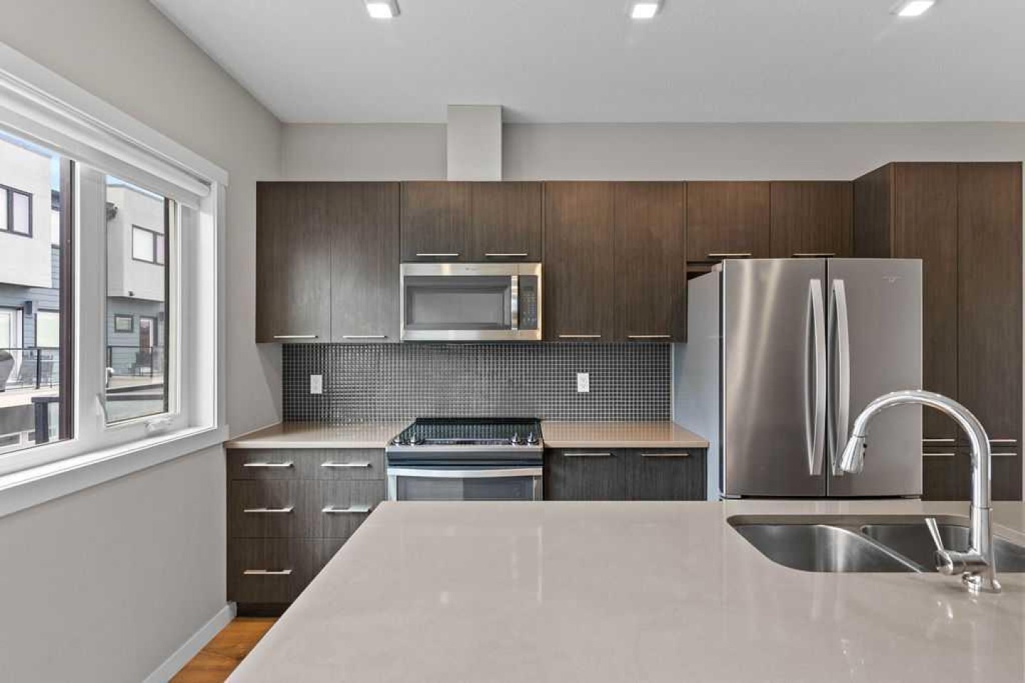 Welcome to this beautifully upgraded townhome in the sought-after Diseno development in Sherwood, NW Calgary. Offering 1,565 sq. ft. of well-designed living space, this bright and sun-filled home is ideally located just steps from the community park and pond, providing peaceful views while remaining within walking distance to the amenities of Sage Hill Crossing. From the moment you step inside, you’ll notice the modern finishes and thoughtful design throughout. The entry level features a versatile flex space—perfect for a home office, gym, media room, or hobby area—along with convenient access to the side-by-side double attached garage. The main living area is open, airy, and perfect for both everyday living and entertaining. Large windows flood the space with natural light and frame scenic park views. The stylish rear kitchen is a true highlight, featuring quartz countertops, upgraded stainless steel appliances, ample cabinetry, and a functional layout that flows seamlessly into the dining area. The spacious living room creates a warm and inviting atmosphere to relax or host guests. Enjoy outdoor living with both front and rear private balconies—ideal for morning coffee or evening unwinding. Upstairs, you’ll find three generously sized bedrooms and two full bathrooms. The primary suite offers a bright and peaceful retreat with a walk-in closet and a modern ensuite complete with a walk-in shower. The additional bedrooms provide flexibility for family, guests, or workspace. This home showcases a full builder upgrade package, including laminate flooring on the main level, window coverings throughout, and attractive exterior finishes featuring Hardie Board siding, stucco accents, and brick detailing for timeless curb appeal. Meticulously maintained, it reflects true pride of ownership. Conveniently located near public transit, major roadways, schools, parks, and shopping at Beacon Hill and Sage Hill Plaza, this home offers an exceptional blend of comfort, style, and location—an outstanding opportunity to own in one of NW Calgary’s most desirable communities.