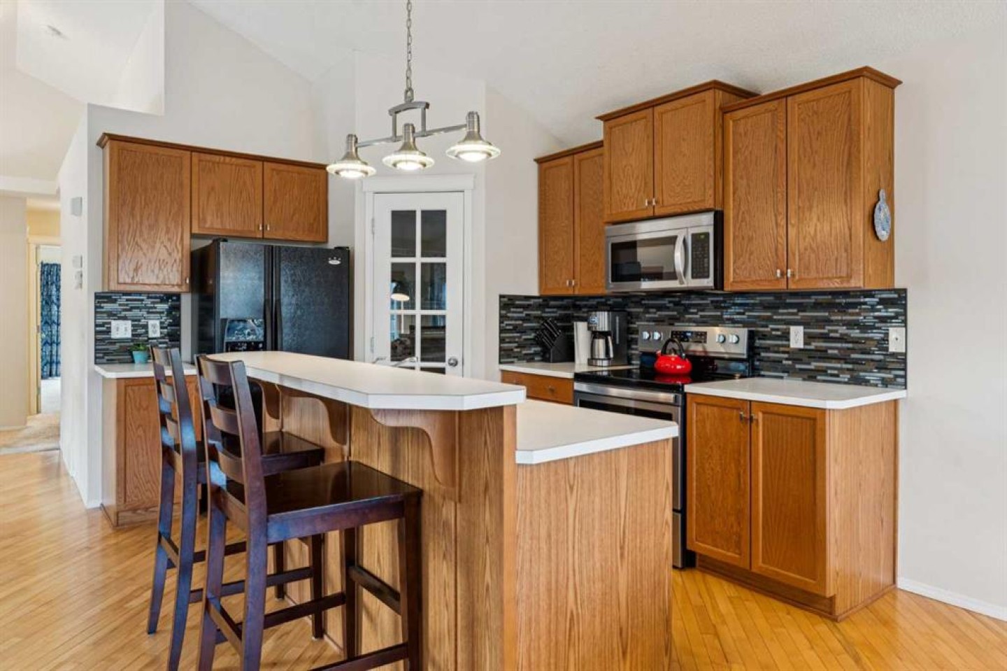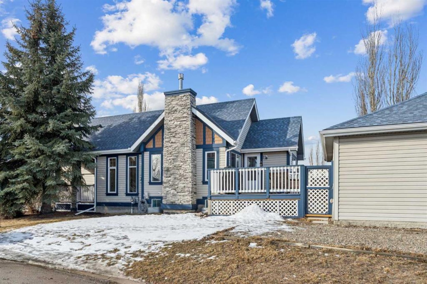This wonderful Bungalow is a perfect family home situated on a corner cul-de-sac location. Welcome home. This beautiful bungalow offers many features- super bright home with vaulted ceilings, hardwood floors, open concept living space, stainless steel and glass railings, and a bright kitchen with a centre island. The living room features a gas fireplace with a tile surround and mantle-style finish. The large primary bedroom also has a walk-in closet with a laundry chute and glass sliding doors that lead to a front balcony. The basement is finished with a large family room, a corner gas fireplace, two more spacious rooms (one of the rooms is being used as an office), a laundry room, a storage room, and another 4 pce bath. The home is a non-smoking, no pet home. The home is close to all amenities, schools, restaurants, shopping, Stoney Trail.