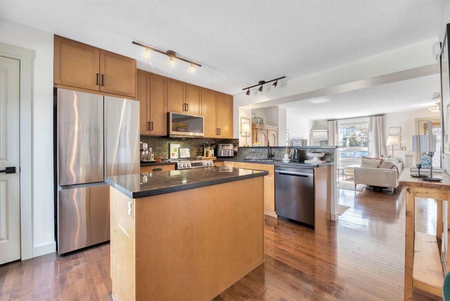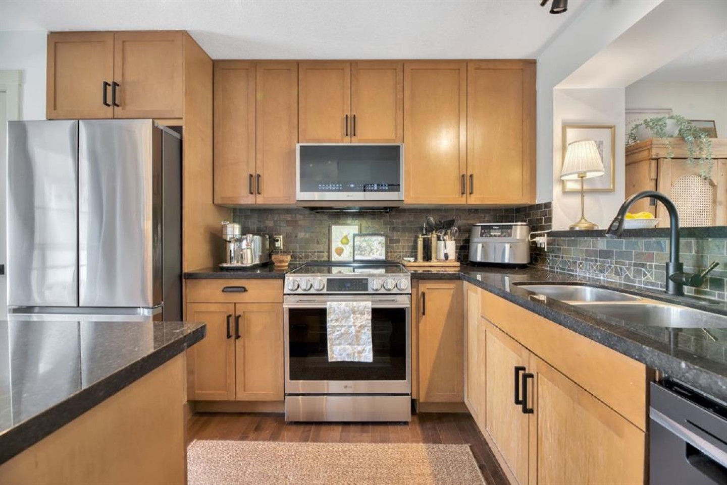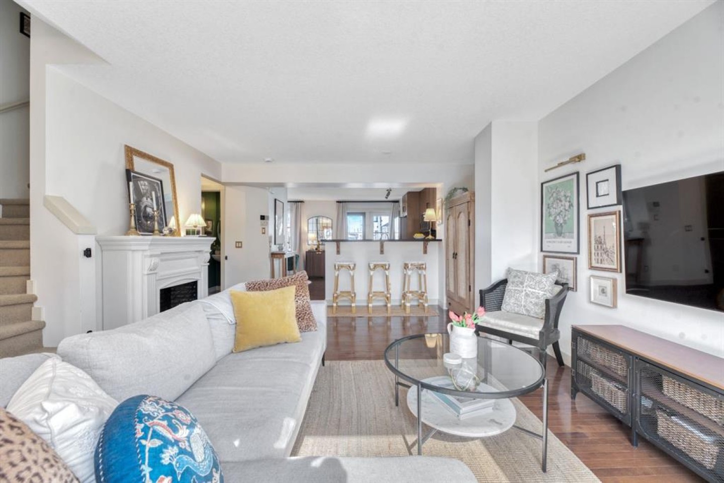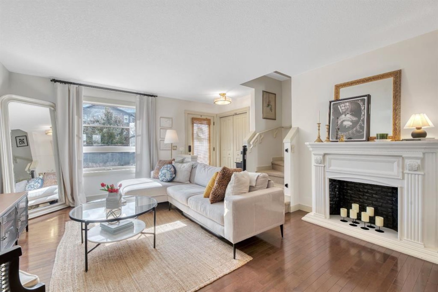 This townhome located in Mosaic of Aspen Woods, offers sophisticated, low-maintenance living in one of Calgary’s most sought-after west-side communities. Ideally located near 17th Avenue, Bow Trail, and Stoney Trail, this home provides quick access to downtown, the Rocky Mountains, and nearby transit, including the LRT. Excellent schools, parks, and walking pathways are all just steps away. This bright home offers over 1220 sq. ft. of living space and features a south-facing primary bedroom, living room, and patio, filling the spaces with natural light throughout the day. The main level showcases hardwood floors, granite countertops, and an inviting kitchen with a convenient eating counter and nook, complemented by upgraded hardware, lighting, and plumbing fixtures. The kitchen is equipped with Samsung and LG appliances, including a Samsung refrigerator, LG induction range with over-the-range microwave, and a Whirlpool dishwasher. Air conditioning adds year-round comfort. A balcony off the kitchen adds a functional outdoor space. Upstairs you’ll find three bedrooms, including a primary bedroom with a walk-in closet and 3-piece ensuite, plus a full secondary bathroom. A main floor powder room adds everyday convenience. The lower level offers ample storage and laundry space, while the double attached garage provides secure parking and additional storage. Located just minutes from Aspen Landing, West District and Westhills Towne Centre, you’ll enjoy easy access to boutique shopping, restaurants, and everyday amenities.