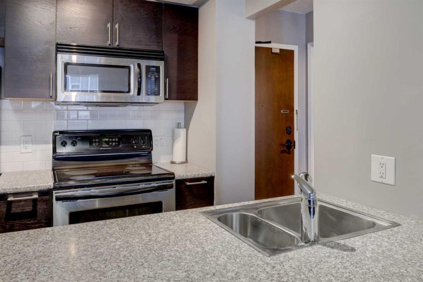 WELCOME HOME to this quiet, and meticulously maintained apartment condo in Calgary’s premier riverside community of Eau Claire! Perfect for a single professional, couple working downtown, weekend retreat, or investment property, this unit offers both comfort and convenience in an unbeatable location. Thoughtfully updated in 2013, renovations include rich walnut cabinetry in the kitchen and bathroom, stainless steel appliances, new backsplash and countertops, updated lighting and switches, fresh paint, door trim, baseboards, and elegant tile flooring throughout. A functional breakfast bar seamlessly connects the kitchen to the spacious living room—ideal for everyday living and entertaining. The generously sized primary bedroom features ample closet space, while the versatile storage/den area offers potential for conversion to in-suite laundry. Step outside to your tiled balcony—perfect for relaxing or summer barbecues. This unit includes a titled underground parking stall and low monthly condo fees of $541, covering all utilities and access to exceptional amenities: a fully equipped fitness centre, sauna, bicycle storage, common laundry, concierge service (Mon–Fri, 8 AM–11 PM), and weekend security. Enjoy the added convenience of an on-site store, wellness centre, and restaurant, all just steps from the Bow River pathways, downtown offices, shopping, dining, and public transit. Don’t miss your chance to own in one of Calgary’s most desirable downtown communities! Be sure to check out the VIRTUAL TOUR link for hi-tech interactive floor plans, hi-def photos, and state of the art virtual tours where you can take a "walk" throughout the rooms of the property.