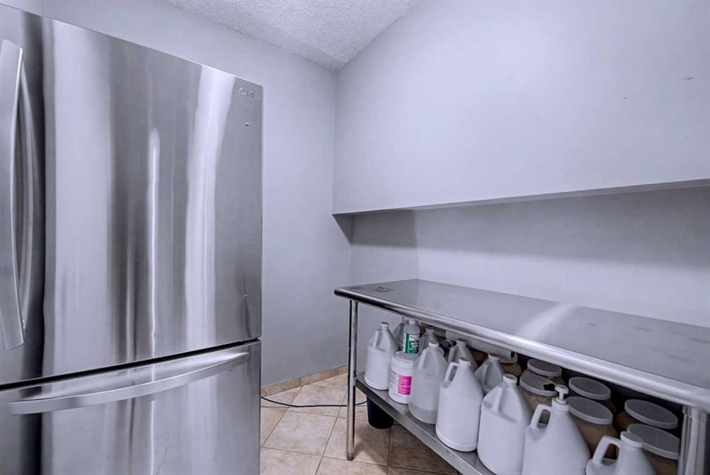 Barbecue located in the patio, Refrigerator in the storage room, Kitchen island cart