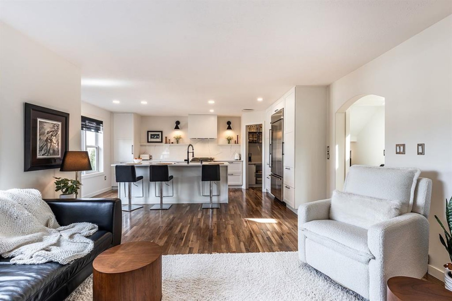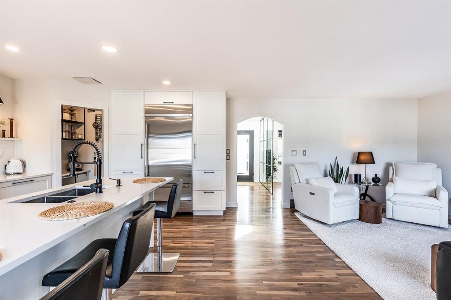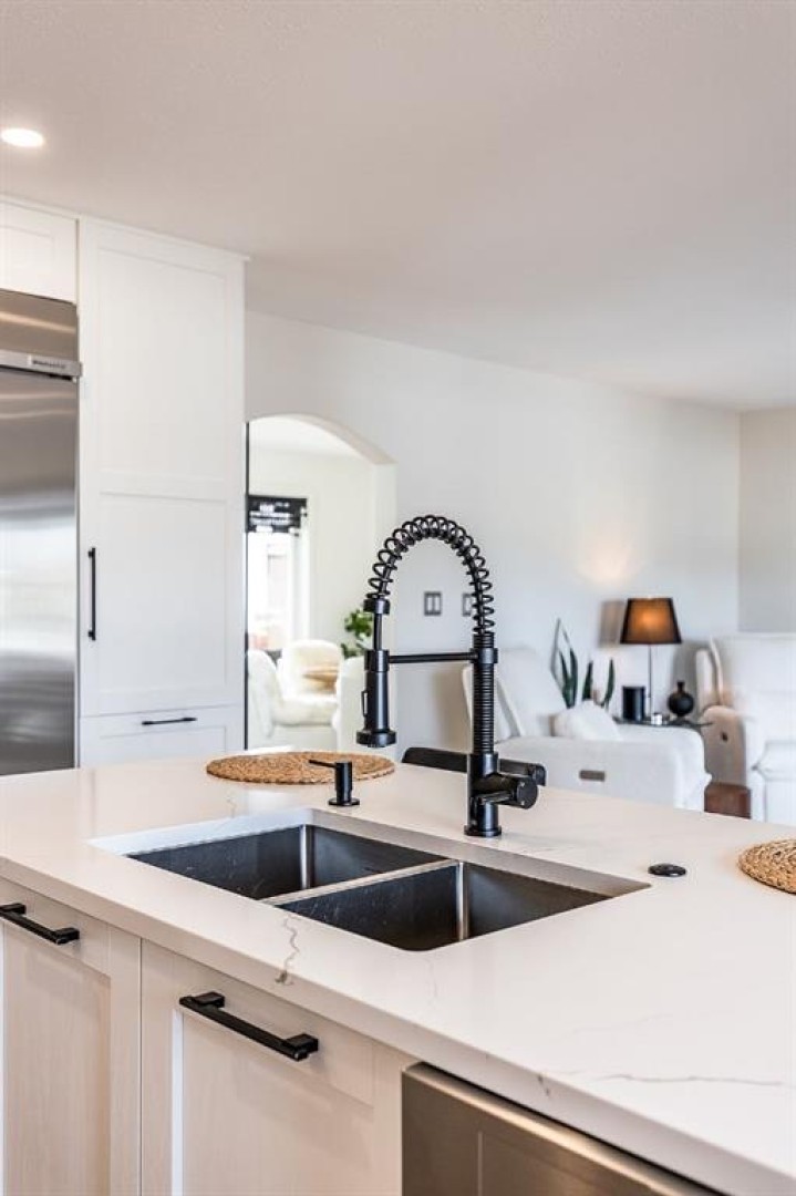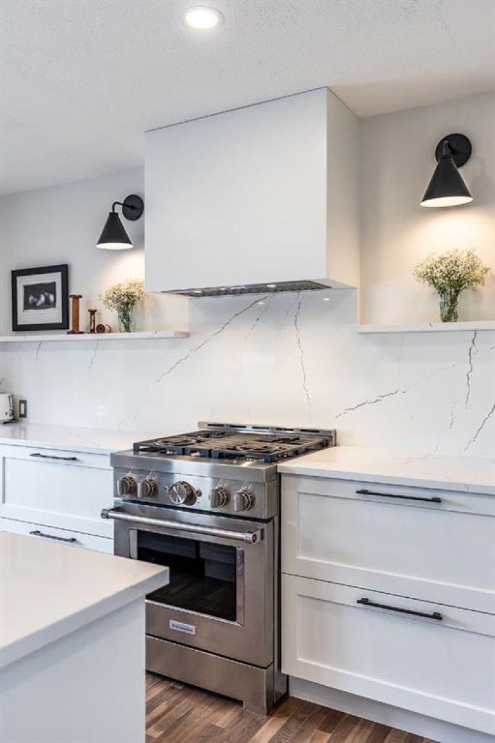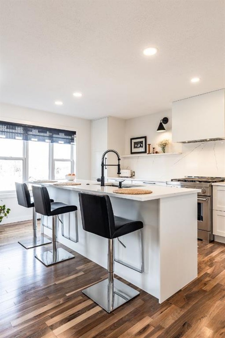 Step into refined living designed for discerning buyers—this fully renovated home offers upscale luxury from top to bottom, inside and out. Every detail has been thoughtfully curated to create a seamless blend of modern sophistication and everyday comfort. The open-concept main floor is both minimalist and striking, featuring rich walnut hardwood flooring and a beautifully designed kitchen where quartz countertops extend effortlessly into a full-height backsplash. Sleek KitchenAid Professional stainless steel appliances are integrated into the cabinetry and matte black fixtures add a bold, contemporary edge, while the dining area is elevated by a stunning modern glass wall—creating a bright, airy space perfect for entertaining. Upstairs, you’ll find three generously sized bedrooms, including a serene primary retreat complete with a 4-piece ensuite featuring a relaxing soaker tub. An additional full bathroom ensures convenience for family or guests. The fully finished basement offers a cozy and inviting atmosphere with cork flooring and carpet underfoot—ideal for movie nights, family gatherings, or quiet evenings in. This level also includes a fourth bedroom and another full bathroom, providing flexibility for guests or a home office. A truly unique highlight is the double attached garage, transformed into an exceptional extension of the home. With durable epoxy flooring, new heater and new spray foamed door/side mount opener, it doubles as an incredible entertaining space while still maintaining functionality. Additionally, the RV parking is an added bonus. Outside, the backyard is a fully landscaped summer oasis designed for relaxation and enjoyment. Both the rear deck and front porch are constructed with low-maintenance composite decking, offering durability without compromising style. Perfectly located close to scenic trails, schools, shopping, and everyday amenities, this home delivers the ideal balance of luxury, lifestyle, and location.