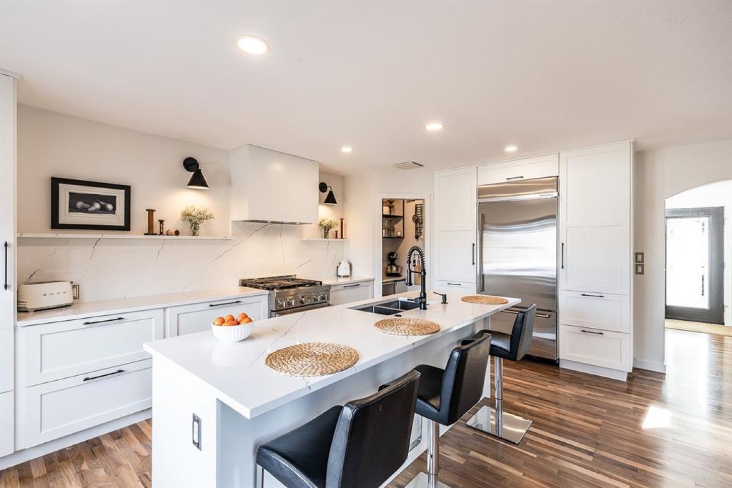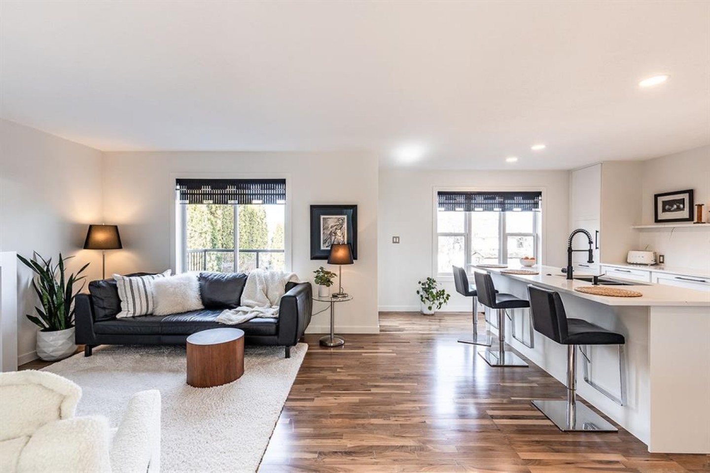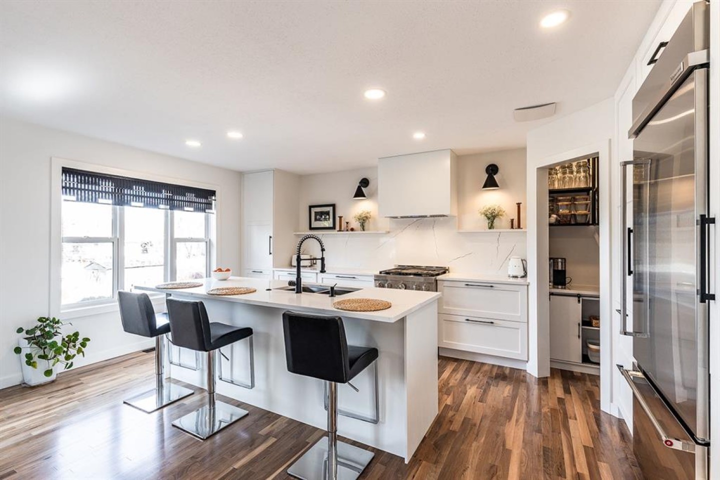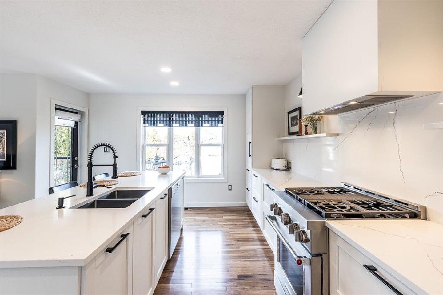 Step into refined living designed for discerning buyers—this fully renovated home offers upscale luxury from top to bottom, inside and out. Every detail has been thoughtfully curated to create a seamless blend of modern sophistication and everyday comfort. The open-concept main floor is both minimalist and striking, featuring rich walnut hardwood flooring and a beautifully designed kitchen where quartz countertops extend effortlessly into a full-height backsplash. Sleek KitchenAid Professional stainless steel appliances are integrated into the cabinetry and matte black fixtures add a bold, contemporary edge, while the dining area is elevated by a stunning modern glass wall—creating a bright, airy space perfect for entertaining. Upstairs, you’ll find three generously sized bedrooms, including a serene primary retreat complete with a 4-piece ensuite featuring a relaxing soaker tub. An additional full bathroom ensures convenience for family or guests. The fully finished basement offers a cozy and inviting atmosphere with cork flooring and carpet underfoot—ideal for movie nights, family gatherings, or quiet evenings in. This level also includes a fourth bedroom and another full bathroom, providing flexibility for guests or a home office. A truly unique highlight is the double attached garage, transformed into an exceptional extension of the home. With durable epoxy flooring, new heater and new spray foamed door/side mount opener, it doubles as an incredible entertaining space while still maintaining functionality. Additionally, the RV parking is an added bonus. Outside, the backyard is a fully landscaped summer oasis designed for relaxation and enjoyment. Both the rear deck and front porch are constructed with low-maintenance composite decking, offering durability without compromising style. Perfectly located close to scenic trails, schools, shopping, and everyday amenities, this home delivers the ideal balance of luxury, lifestyle, and location.