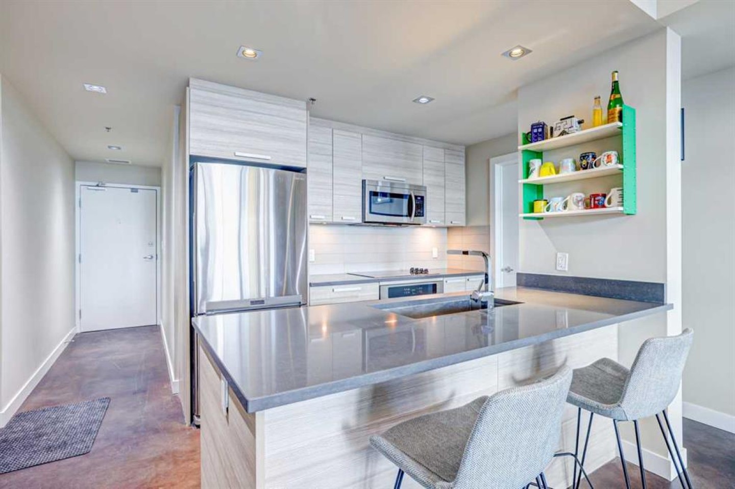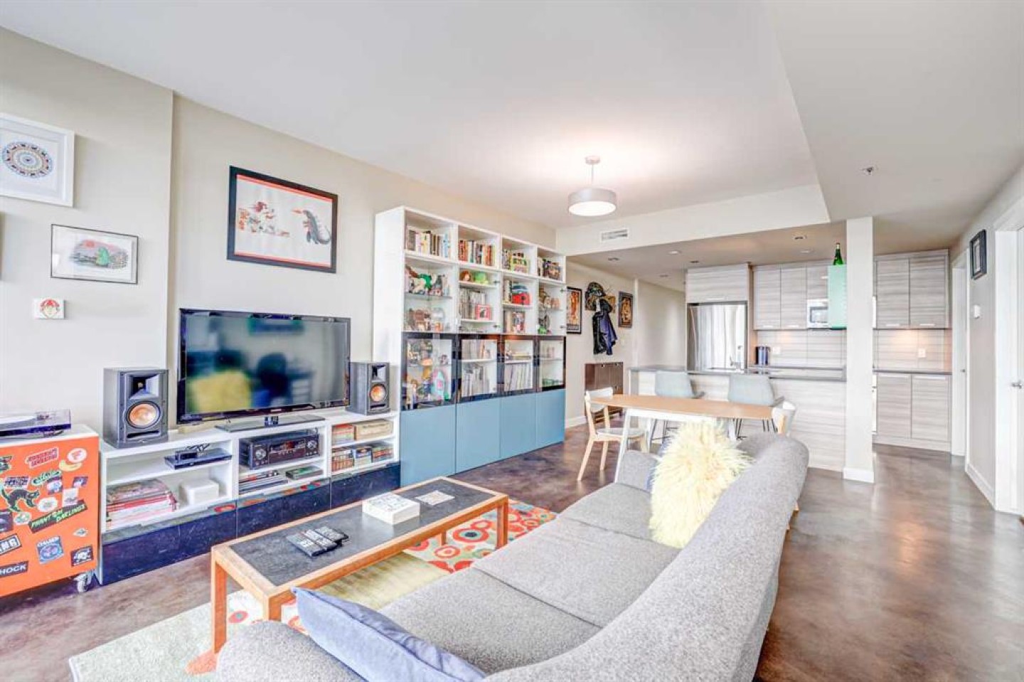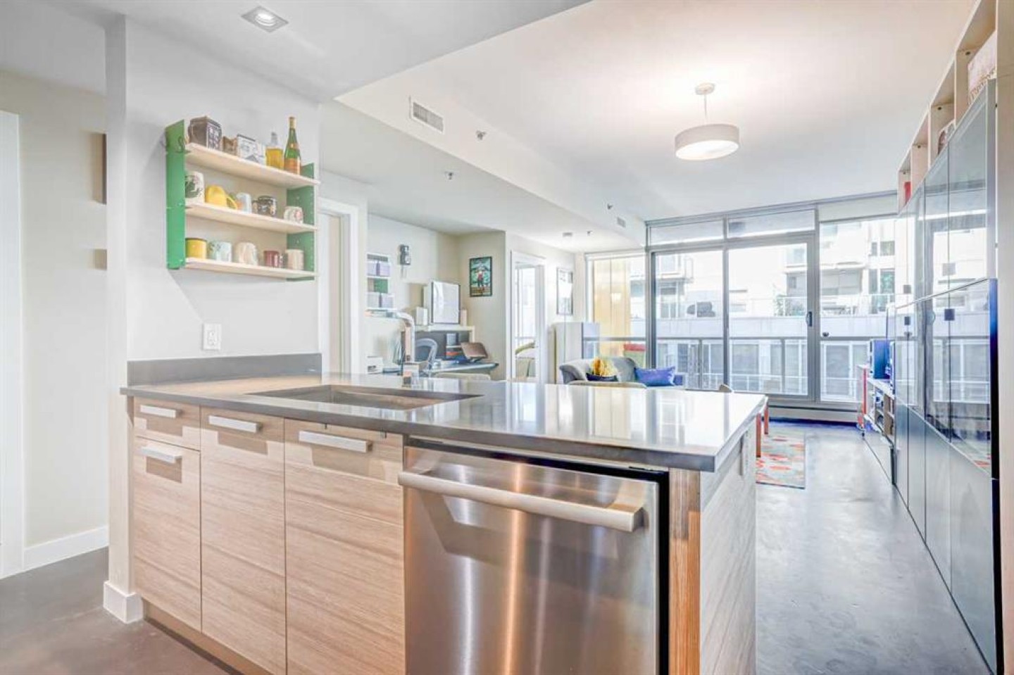 Contemporary comfort and exceptional inner-city convenience come together in this west-facing 1 bedroom + den unit in Pixel by Battistella, ideally positioned in the heart of Sunnyside. Pride of ownership is evident throughout as this original owner home has been meticulously maintained, offering both style and functionality in a highly walkable location. Polished concrete flooring introduces a contemporary aesthetic while delivering durability and low-maintenance everyday living. An open concept layout creates natural flow between spaces, centred around a dining area that connects seamlessly to both kitchen and living zones. Culinary creativity is supported by a well-appointed kitchen featuring quartz countertops, full-height cabinetry, stainless steel appliances and a peninsula island that encourages casual dining and conversation. An expansive built-in workstation provides exceptional flexibility for working from home, creative pursuits or organized daily living, offering more surface area than typically found in comparable units. Floor-to-ceiling windows span the living room, drawing in natural light throughout the day while creating a seamless transition to the full-width west-facing balcony complete with a gas line for barbeques and space to unwind outdoors. A larger primary bedroom easily accommodates a king-sized bed while oversized windows enhance both light and comfort. Dual walk-through closets enable excellent storage and connect directly to the 4-piece bathroom for added convenience. A versatile den delivers additional flexibility for a home office, guest room, hobby space or extra storage depending on your needs. Comfort is elevated with air conditioning ensuring a cool retreat during warmer months. In-suite laundry adds everyday ease while titled parking and an exceptionally large titled storage locker on P2, one of only 2 of its size in the building, provide rare and valuable additional space. Residents enjoy access to a stunning rooftop terrace designed for connection and relaxation, complete with fireplaces, lounge areas and panoramic views of the city skyline and Bow River. A pet-friendly building further enhances lifestyle flexibility. Daily life unfolds effortlessly with Safeway and the LRT station just 1 block away, while Kensington’s shops, restaurants and cafes are moments from your door. Pathways along the Bow River and Prince’s Island Park invite outdoor recreation while the downtown core remains within easy walking distance, supporting a vibrant and connected urban lifestyle. Truly an exceptional home in an unbeatable, extremely walkable location!