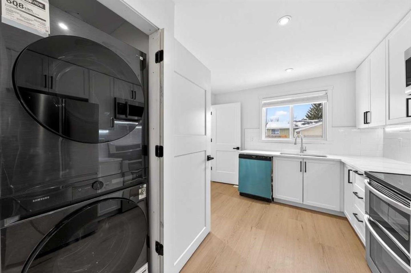 Dishwasher, Dryer, Electric Stove, Microwave Hood Fan, Refrigerator, Washer, Washer/Dryer Stacked