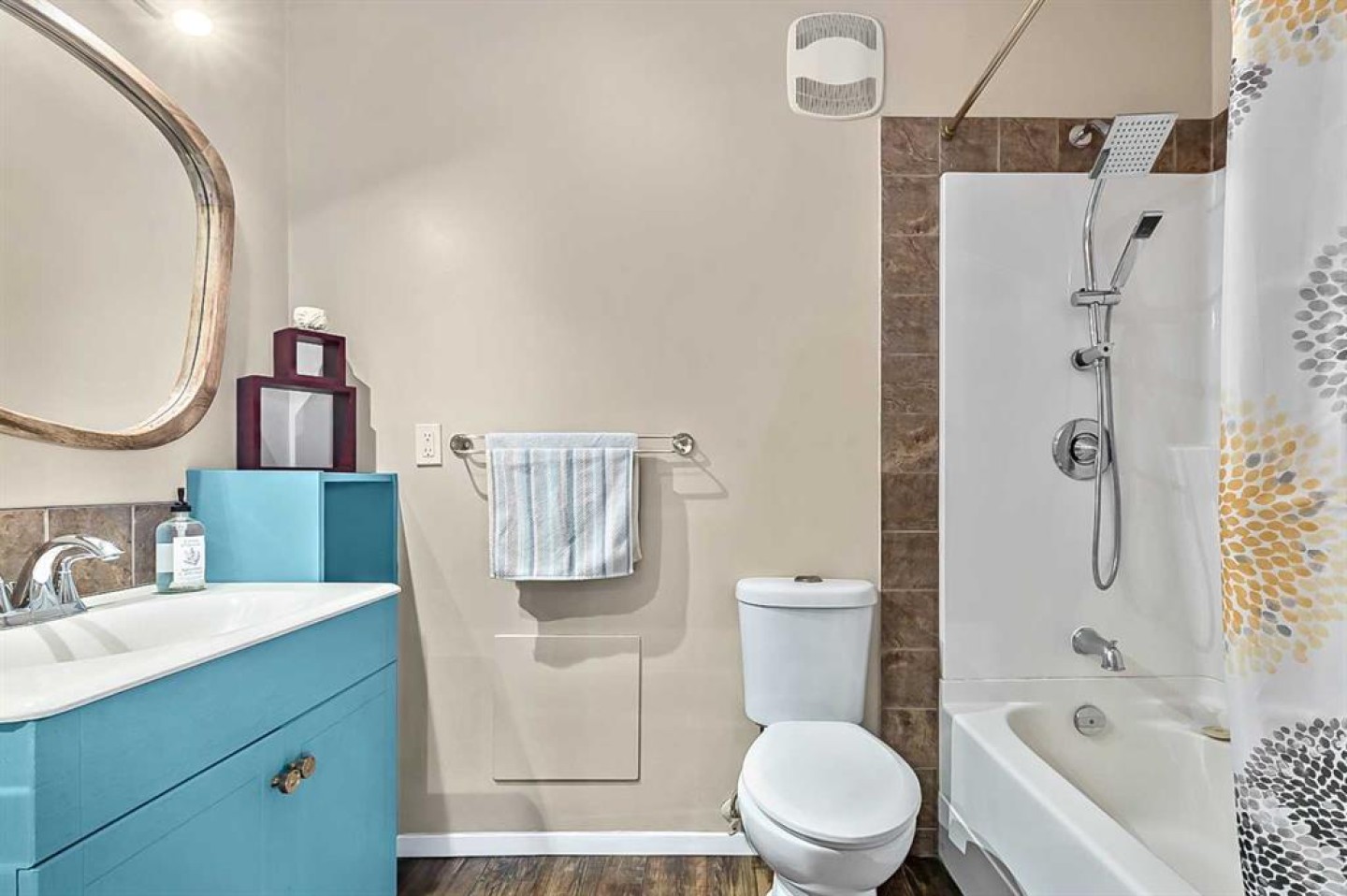 Shoe cabinet at front door, bathroom mirror